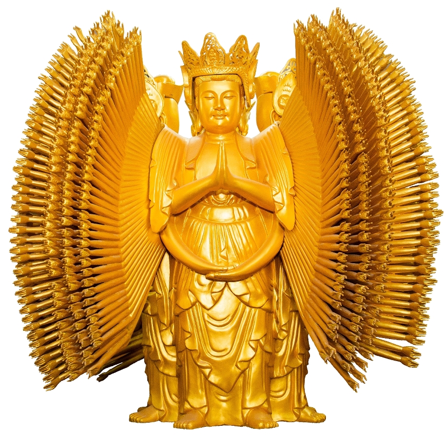观音是我国民间信仰的四大菩萨之一,象征着大慈悲。不同的文献对千手观音的造型记载有所不同,但大同小异。制作上相对复杂,尺寸必须精准计算手部的位置,一层一层地套榫,再作雕刻。图中所示是以厦门南普陀寺千手观音为原型。