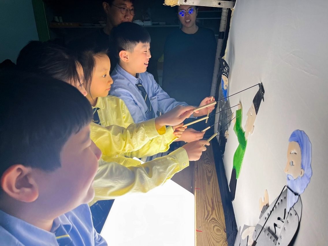 除了社区活动,郑敏琪亦于2022年把皮影戏带入她所任教的利玛窦中学,作为跨学科课堂的主题,把皮影切入到不同学科,如常识科、中文科、英文科及视觉艺术科的知识学习。「刚开始只有我一位老师,以一个星期一堂的兴趣班形式作推广。后来获得校长的支持,加上其他学科老师的协助,让皮影结合不同学科的知识,正式走进课堂。」她介绍,课程从每个学年初的10月份开始,首先利用皮影戏偶引导学生对光影的探究,自行找出适合制作皮影戏偶的透光材料,再由老师协助学生用环保物料制作皮影戏偶及戏台;在课堂的中后段,老师会带领学生利用儿童故事改编剧本,学生再翻译成英文,在翌年的2月以皮影戏形式在学校开放日中演出。