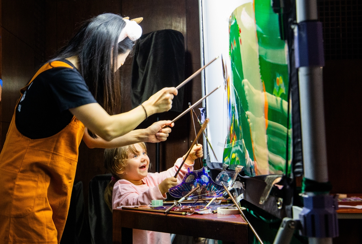 为响应环保,剧团举办的工作坊亦会提供可循环再用的物料给小朋友亲手制作皮影戏偶。郑敏琪说:「我们会教导他们善用洗干净的一次性材料,如可以在透明饭盒上面画出形状、剪出图案再上色。一次性饮管可以剪开四边开口,穿过一次性筷子,把所有东西用胶纸拼贴起来,便能够制作出一个投影用的小戏偶。」