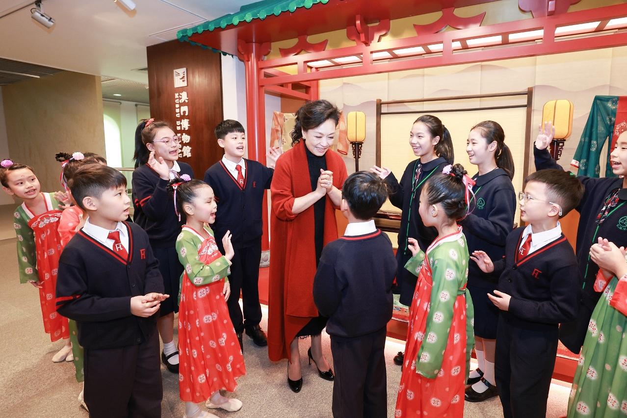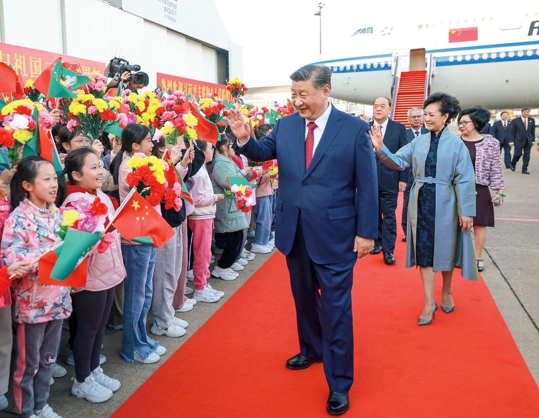 习近平主席一行乘坐的专机于12月18日下午4时许降落在澳门国际机场。习近平和夫人彭丽媛走出舱门,向欢迎人群挥手致意。澳门警察乐队奏响热情洋溢的欢迎曲,舞龙舞狮表演喜气欢腾。舷梯旁,两名少年儿童向习近平和彭丽媛献上鲜花。在澳门特别行政区第五任行政长官贺一诚和夫人郑素贞陪同下,习近平和彭丽媛同前来迎接的人员亲切握手。数百名澳门青少年和各界群众代表挥动国旗、特别行政区区旗和鲜花,表达热烈的欢迎。