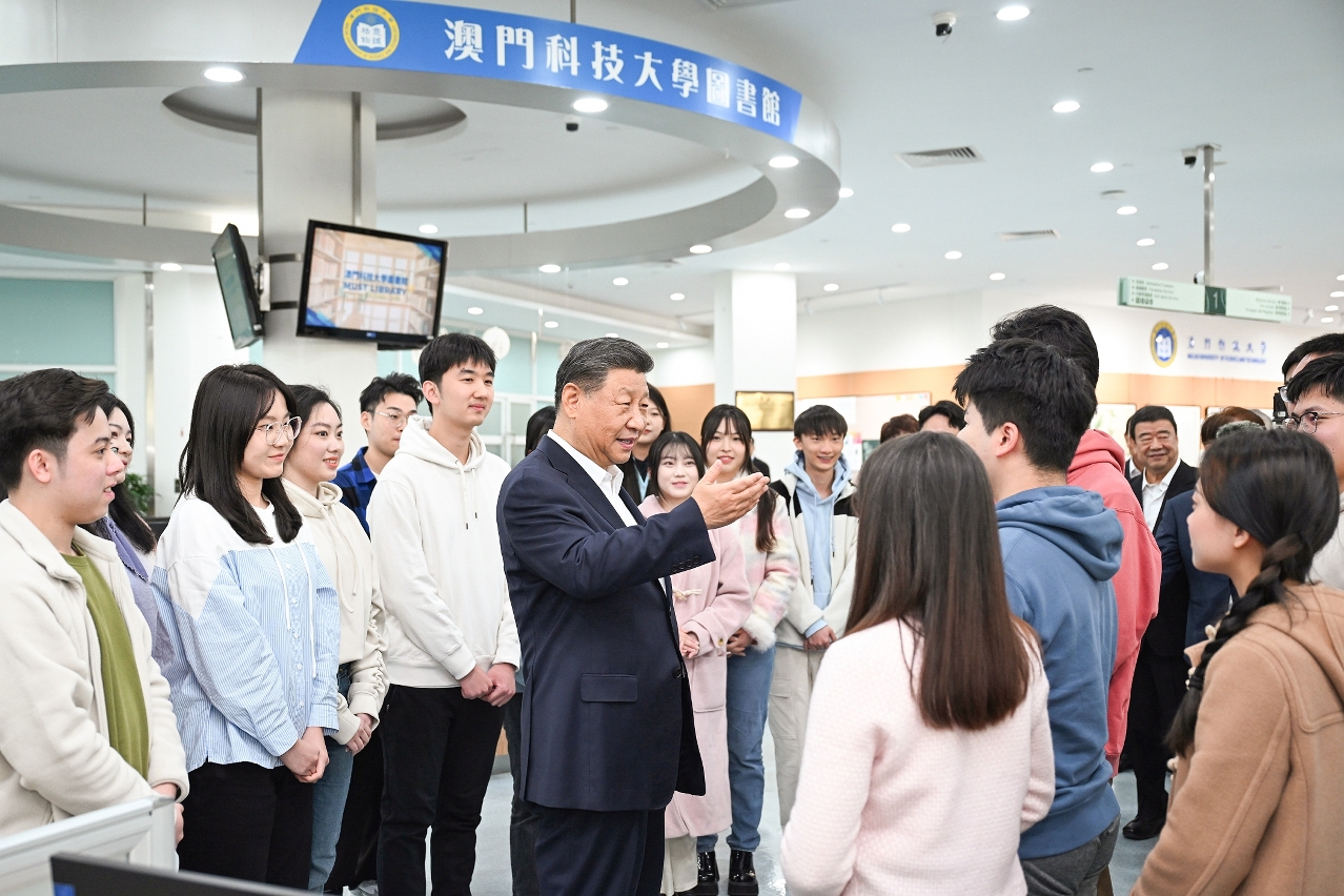 随后,习近平来到学校图书馆,参观「全球地图中的澳门」粤港澳大湾区与澳门古地图展,察看馆藏珍贵书籍。看到习主席的到来,正在查阅资料的同学们十分激动。习近平向大家详细询问学习专业、研究领域和生活情况等,勉励同学们珍惜宝贵的学习时光,多汲取有益的知识,让网络资源成为学习和科研的好帮手。图书馆大厅里,掌声热烈,科研人员、在校师生高声向习近平主席问好。习近平说:「看到澳门教育兴旺,大家朝气蓬勃、充满自信,我感到很高兴。要始终从战略高度重视教育,紧紧围绕国家和澳门发展的需求布局学科体系、培养高素质人才。希望你们树立远大理想,与祖国共命运、与时代同步伐,实现自己的人生价值。祝愿并相信澳门科技大学明天会更好,澳门明天会更好。」