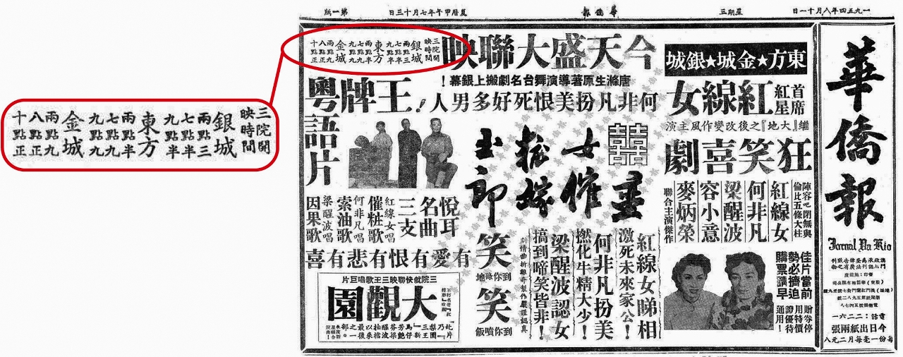 各家戏院的放映时间基本是一致的,但当两三家戏院同放一套影片,而“拷贝”不足时,开场时间就会错开15分钟(请参看当年戏院广告),以便“走片”。