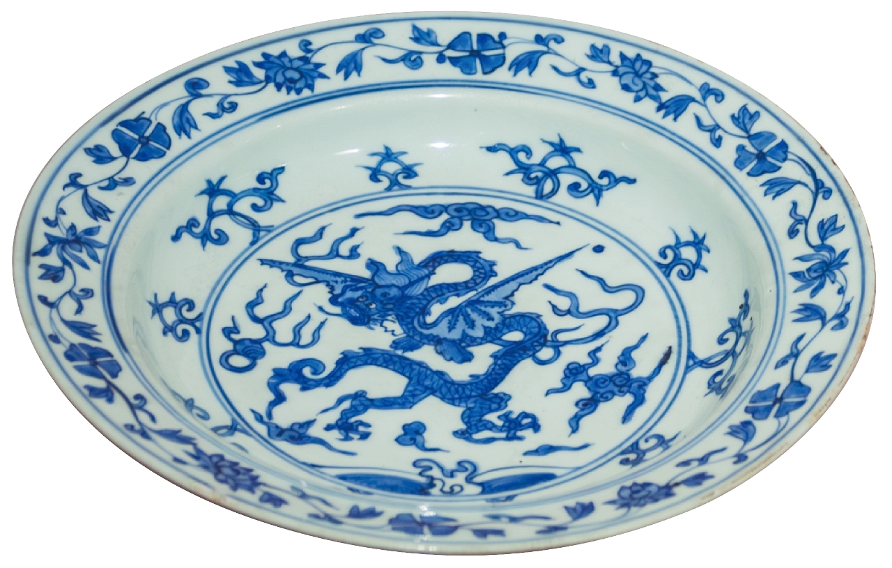 瓷盘是16世纪初起运输到葡萄牙最常见的中国外销瓷之一。此盘薄胎白釉,青花装饰,弧腹窄沿微撇。盘心双圈内绘翼龙逐火珠纹,口沿饰有缠枝莲花间四叶纹带,外壁六组云马纹开光分隔以三尾云纹,外沿边五组折枝花卉间吉祥图案。盘底印有双行六字「大明宣德年制」款。