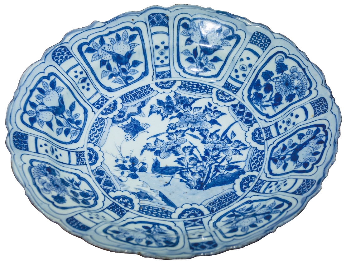 盘呈菱花式,斜折沿,弧腹折腰,平底,圈足。口部变形明显。内、外壁青花装饰。学界一般称此类开光的瓷器为「克拉克瓷」,是明代晚期主要的外销瓷品种。然而,包括故宫博物院南大库遗址在内的多处国内遗址也相继出土有克拉克瓷,说明此类瓷器也在明代国内市场流通。