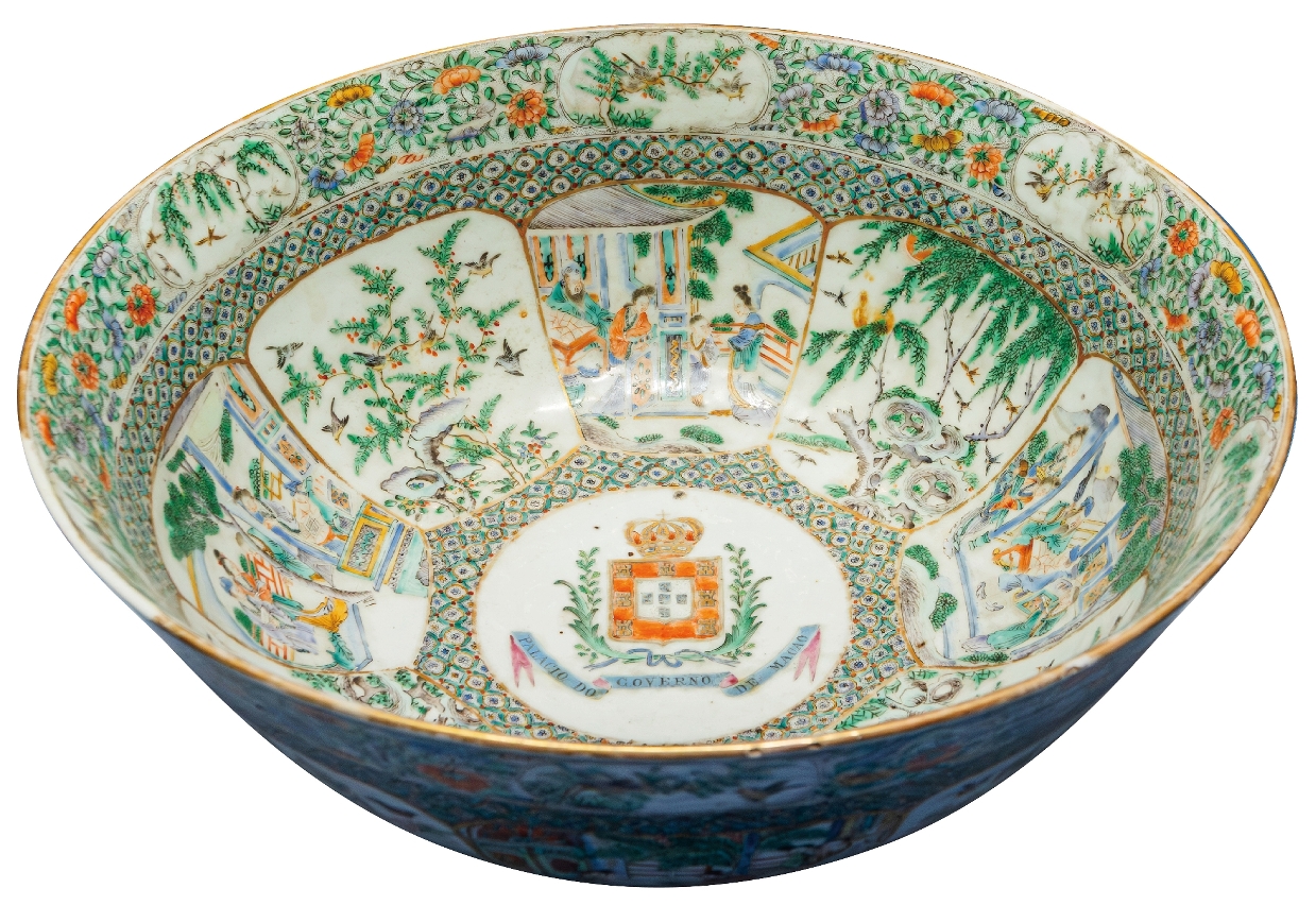 19世纪中后期,澳门总督府曾向广州订制多批饰有葡萄牙徽号的广彩纹章瓷器,作为日常使用及陈设装饰用器。此件潘趣碗构图紧凑丰满、装饰色彩华丽,是19世纪以来广彩瓷器的典型风格。