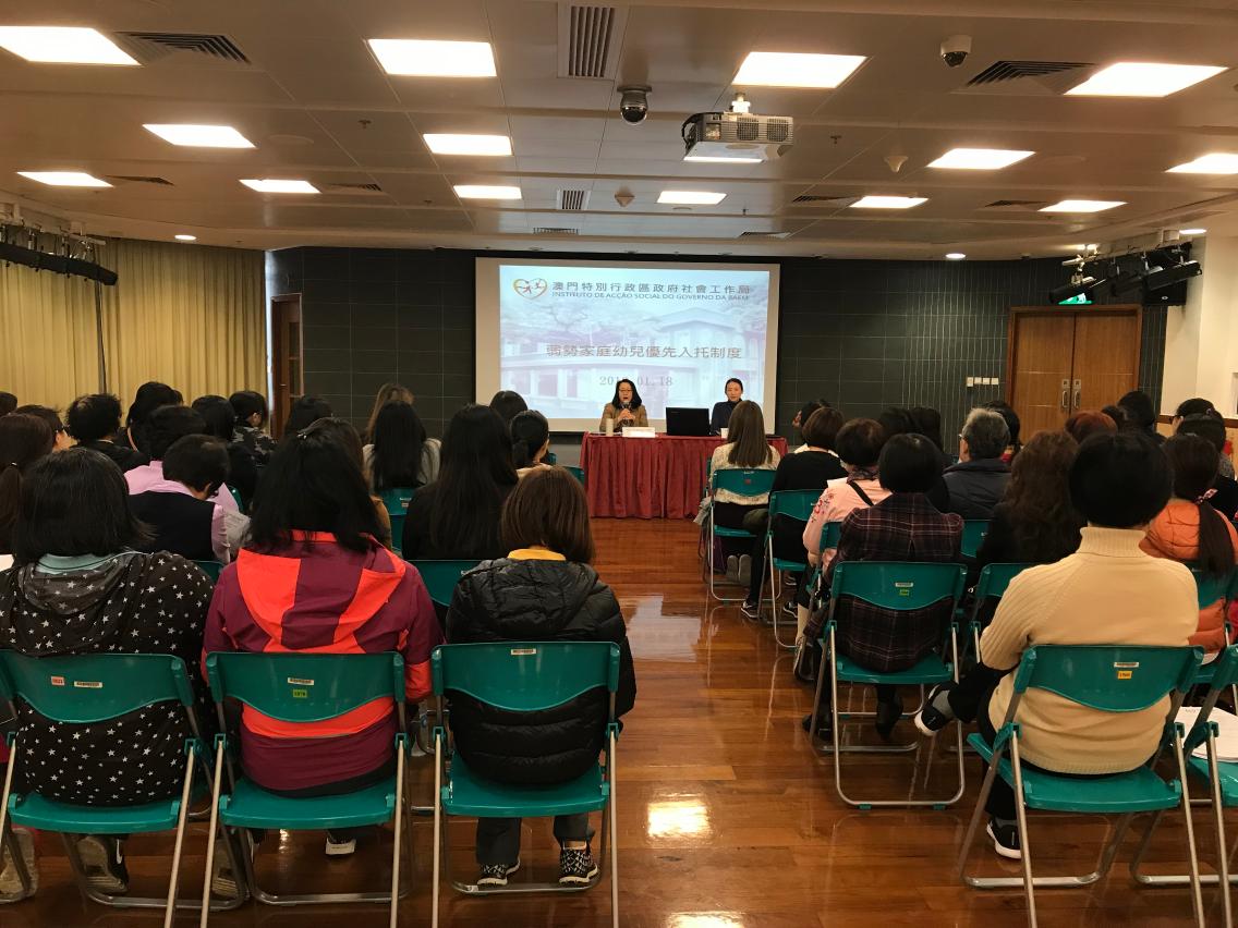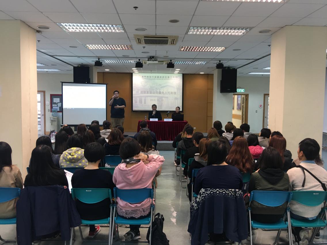 引介会分别于2018年1月16日及18日在民政总署辖下营地活动中心及下环活动中心举行。会上,社工局代表分别向受资助托儿所和社服设施人员介绍制度的内容,并详细解答参与者的各项查询。