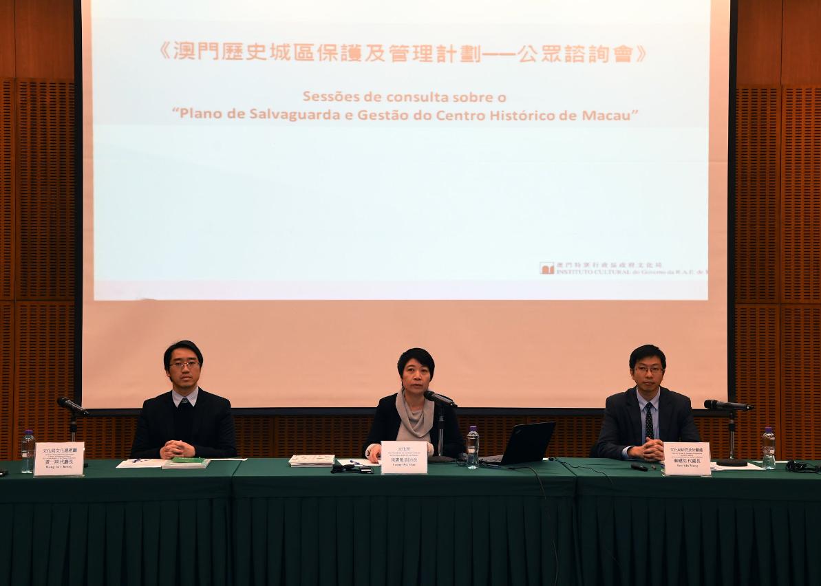 首场公众咨询会由文化局副局长梁惠敏、文化遗产厅代厅长黄一翔、文化遗产厅研究及计划处代处长苏建明出席,向巿民详细讲解《澳门历史城区保护及管理计划》咨询文本的内容,包括具体的保护对象和管控措施等。当天出席者众,市民踊跃发言,积极表达不同意见,文化局代表认真聆听并汲取有关意见。第二场公众咨询会续于二月十一日下午三时在澳门文化中心会议室举行,欢迎市民踊跃参与。