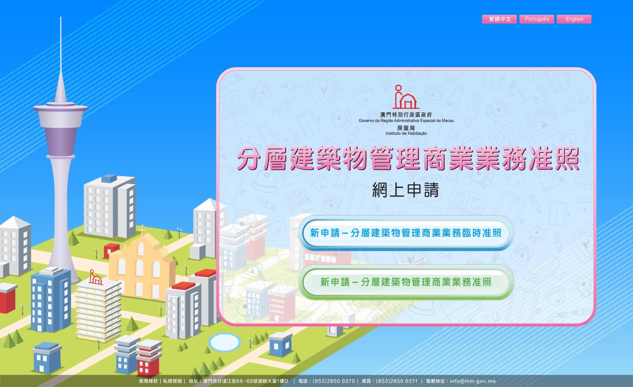 同时,房屋局明(6)日起接受分层建筑物管理商业业务准照及临时准照之申请,除亲临房屋局青洲办事处及离岛办事处办理,亦可透过网上进行申请(www.ihm.gov.mo)。如有查询请致电2851 9709。