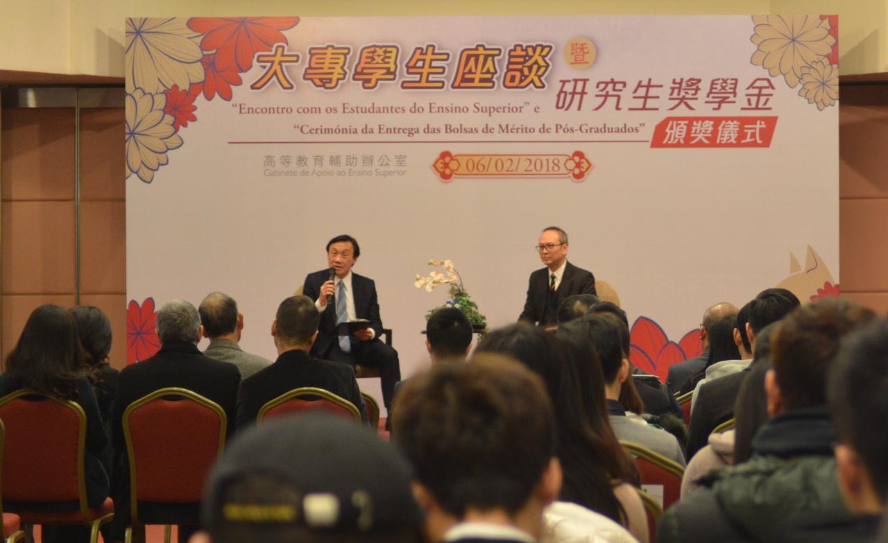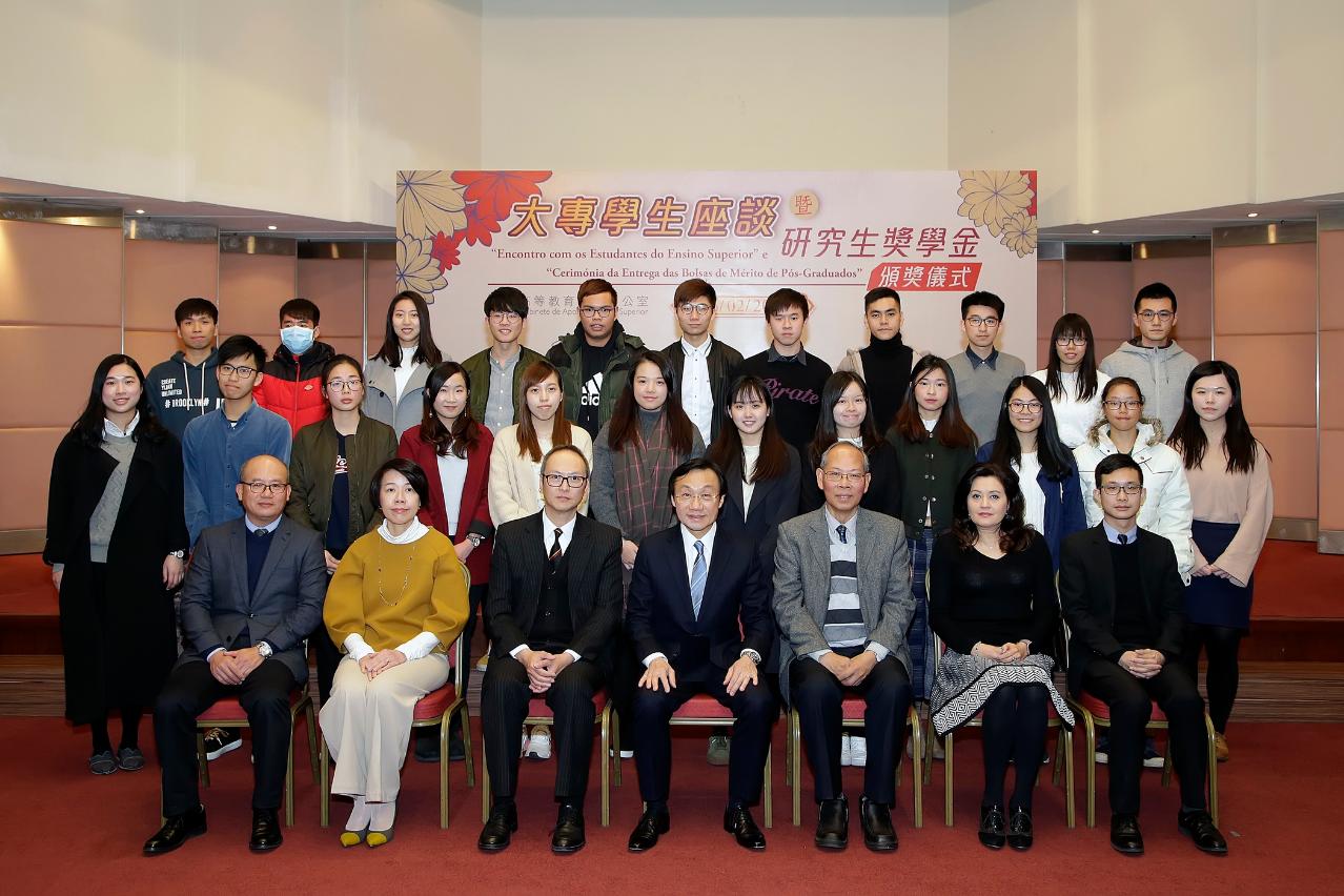 座谈会后,研究生资助发放技术委员会举行研究生奖学金颁奖仪式,2017/2018学年研究生奬学金获奖者共有127人,其中博士20人,硕博连读的博士5人,硕士100人,学硕连读的硕士2人。此外,还有1名获奖者获得社会工作局发放社会工作专业范畴的硕士奖学金,以及2名赴葡萄牙科英布拉大学升学的学生获得人才发展委员会发放硕士奬学金。出席的获奖者获谭俊荣司长、高教办苏朝晖主任、研究生资助发放技术委员会李沛霖委员、何丽钻委员、何丝雅委员及高教办曾冠雄副主任颁发证书。