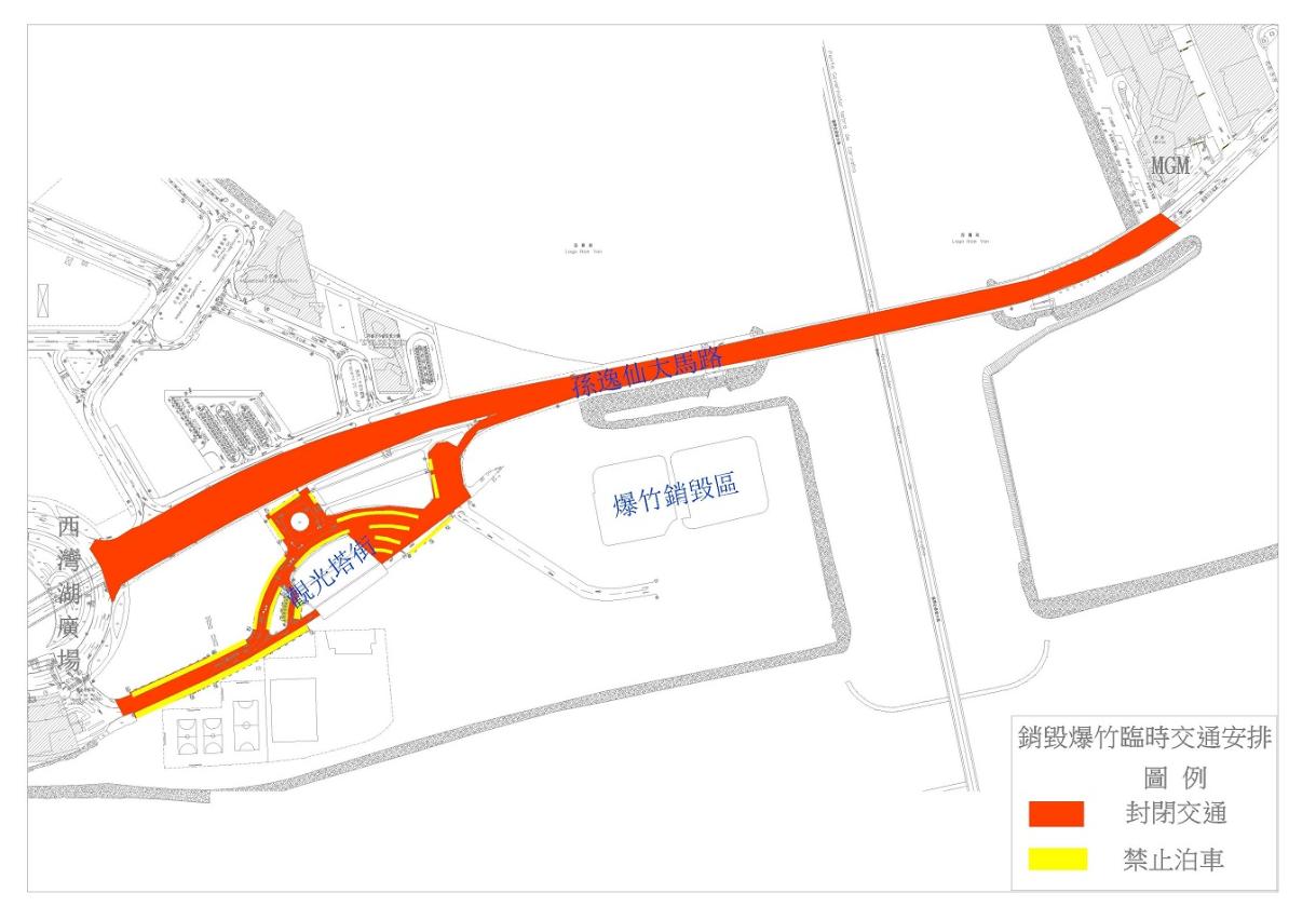 配合民政总署设置爆竹烟花燃放区及销毁爆竹,由2月14日(年廿九)至2月21日(年初六),孙逸仙大马路、观光塔街及氹仔史伯泰海军将军马路实施临时交通安排(详见附表)。