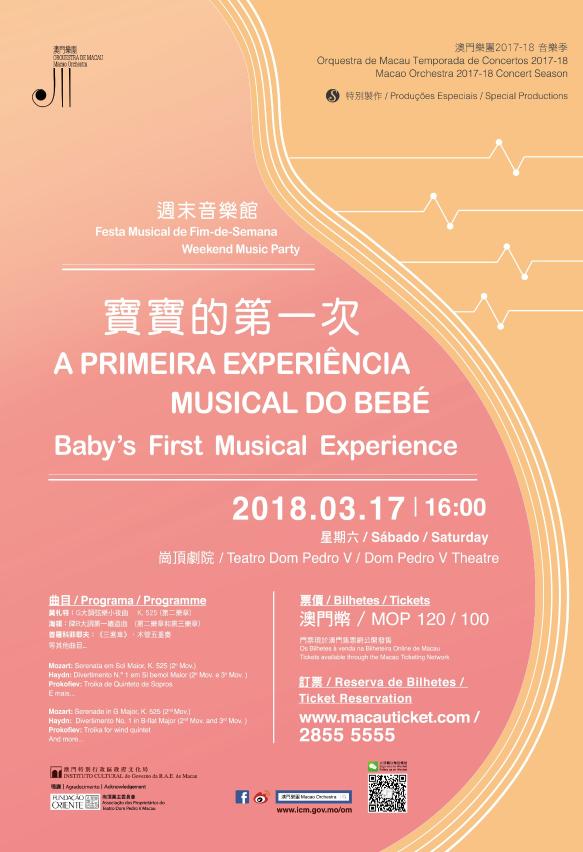 《周末音乐馆—宝宝的第一次》音乐会票价一百二十及一百澳门元。购票热线二八五五五五五五,网上订票www.macauticket.com。详情及节目查询可于办公时间内致电二八五三零七八二或浏览澳门乐团网页www.icm.gov.mo/om。