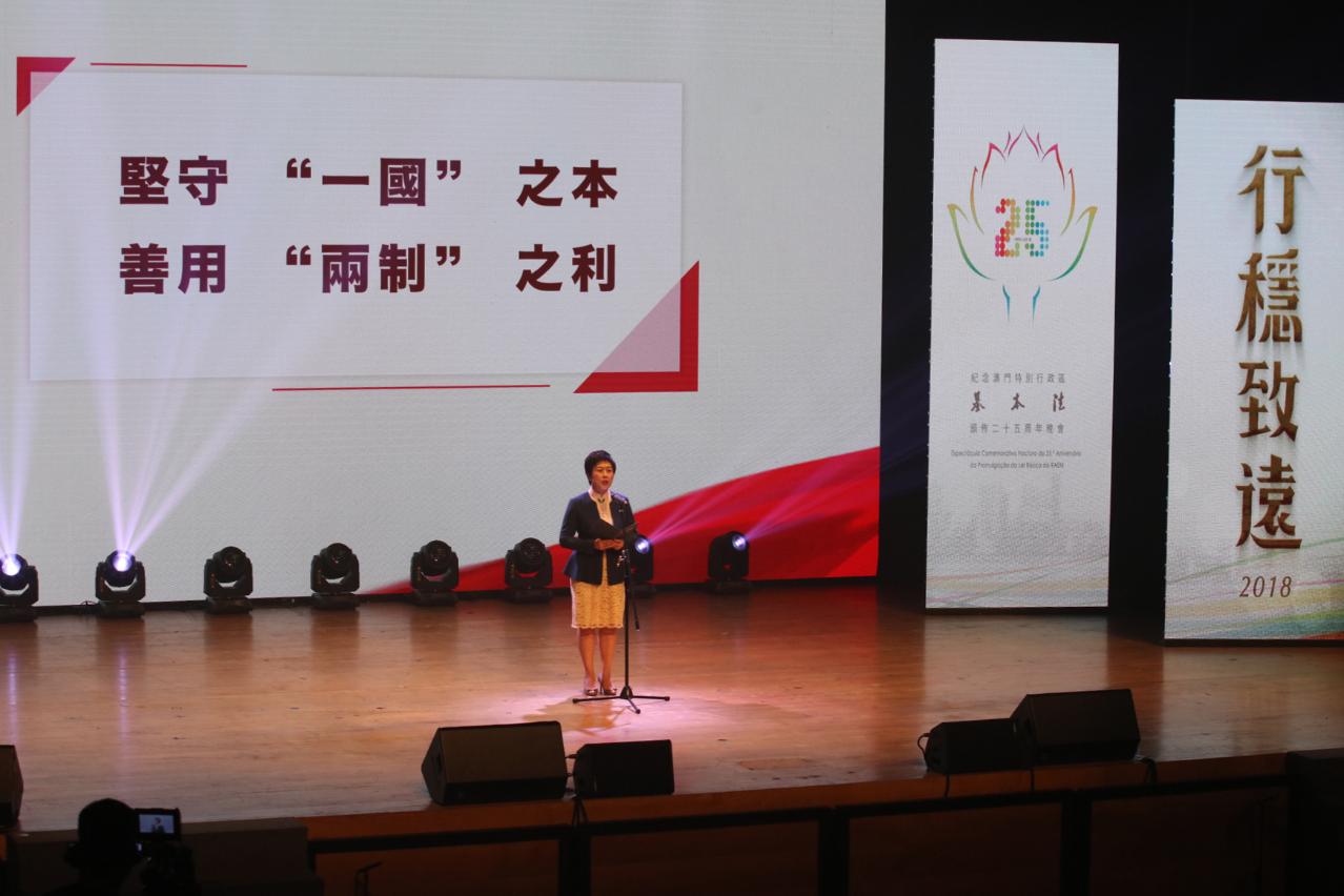 作为纪念《澳门特别行政区基本法》颁布二十五周年系列活动的重点项目:“行稳致远”──纪念《澳门特别行政区基本法》颁布二十五周年晚会,以“根基、繁荣、守护及传承”为晚会主轴,展现多年来“一国两制” 和《基本法》在本澳成功实践的丰硕成果。晚会不仅邀请了与《基本法》同龄的年青人上台真情对话,分享他们与《基本法》同为25岁的感受,还邀请了多个组织和团体参演,包括澳门中华学生联合总会、澳门中华新青年协会及本地青年音乐团、舞蹈团、歌手等。他们以青春活力向观众呈现了多媒体舞台剧《普法路上》、音乐剧《小城故事》等连场歌舞,从青少年的角度透视出《基本法》的生命力。晚会更获得中国人民解放军驻澳部队鼎力支持,参加演出舞蹈《三天三夜》,讲述于“天鸽”风灾后,驻澳部队支援特区的情况。行政法务司司长陈海帆在晚会致辞,对多年以来基本法推广工作的情况作总结,并期望社会各界今后能继续奋发有为、自强不息,承先启后地维护《基本法》的全面落实,确保“一国两制”行稳致远。晚会最后以歌舞《盛世莲花》作压轴,展现《基本法》对澳门繁荣安定的贡献,为晚会画上圆满句号。