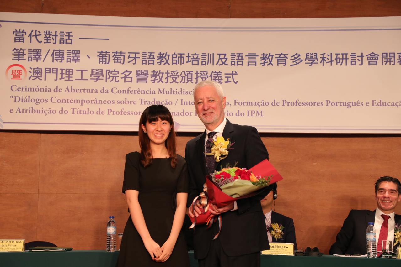 李向玉致研讨会开幕辞时表示,理工学院多年前便坚持推动语言教学,尤其将保证持续、优质的葡语教学水平确定为战略发展重点。远在澳门作为中国和葡语国家平台这个概念兴起之前,已身先力行,促成并贯彻这一理念,努力的成果有目共睹,作为一所高等教育机构,师资、学生、课程、科研都是累累硕果,多年来培养了一批又一批的毕业生,教学质量得到了国内和国际认可。在加强办好葡语相关专业的多个学位课程,还与中国、葡萄牙及葡语系国家高校展开了丰富多样的合作。随着新高等教育法的实施,理工新学年将推出实力雄厚的师资阵容,负责上述领域硕士及博士课程的教学任务。本次研讨会旨在促进教学和科研,更与理工学院的基本宗旨密切相关,透过“当代对话”,专家学者围绕葡语教师培训、语言教学以及一切与笔译及传译教学、科研相关的议题进行广泛讨论,呈现科研和教学成果,理工学院诚挚感谢所有与会者的参与。李向玉接着表示,值这次研讨会为契机举办颁授荣衔仪式,请来了里斯本大学名誉校长、葡萄牙驻联合国教科文组织大使沈帕奥(António Sampaio da Nóvoa)教授,这位教育学多个领域的专家,成就斐然、享誉世界的大家鸿儒,也是公民典范,理工学院授予其荣誉教授头衔,其名将列入理工学院名师名册,有着特殊的含义和意义。