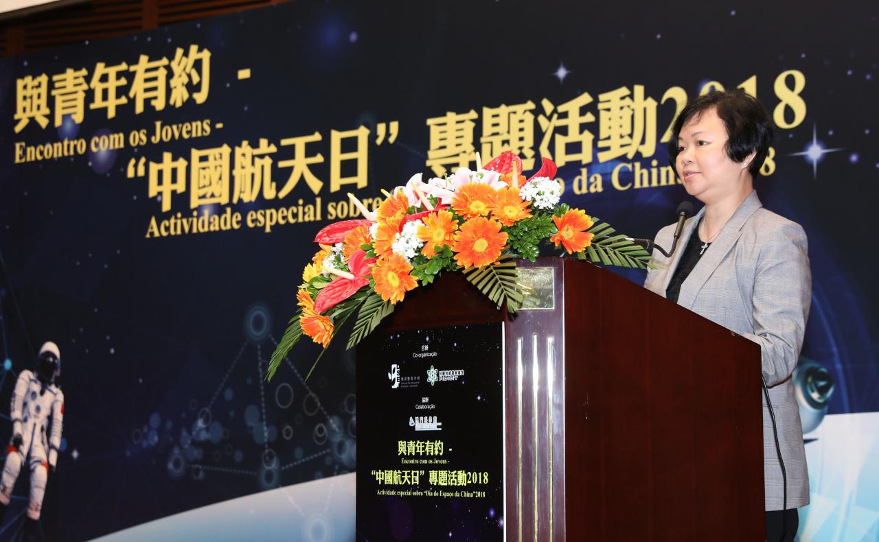 梁慧琪在致辞时表示, 我国的航天事业在近年取得了举世瞩目的成绩并快速发展,中国航天事业正进入“超级2018”, “北斗”卫星密集发射及探月工程计划,对国家今天所取得的航天成就感到骄傲及引以为豪。特区政府一直致力推动科普教育的工作,希望青年同学们透过今次座谈会可以在认识国家航天科普发展和成就的同时,提升爱国爱澳情怀和中华民族自豪感,亦要学习并传承不断探索,敢于追逐梦想的精神。马志毅致辞时亦表示衷心祝愿中国航天“超级2018”的各项任务圆满成功,感谢主讲嘉宾来澳分享祖国航天科技的最新成果及成功经验,同时表示科学技术发展基金将一如既往,持续不断地支持澳门的科技和科普事业不断向前发展。在国家科技部的大力支持下,澳门快将成立“月球与行星科学国家重点实验室”,勉励同学们努力学习,树立爱国爱澳、自强不息的高尚情怀,为实现中国梦、航天梦及建设更美好的澳门贡献自己的一份力量。
