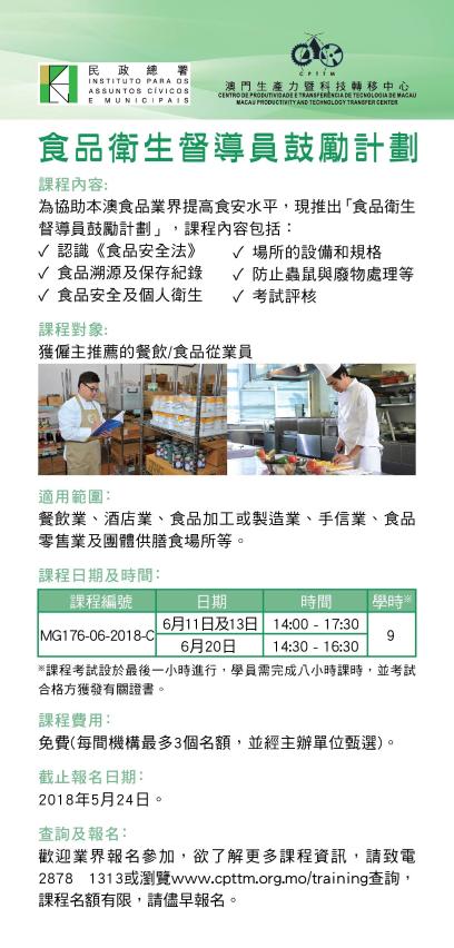 六月份课程开始接受报名,报名日期至五月二十四日,欢迎有兴趣的食品业界参加。有关课程信息或报名详情可浏览澳门生产力暨科技转移中心网站www.cpttm.org.mo/training、民署食品安全信息网www.foodsafety.gov.mo,或可致电2878 1313查询。