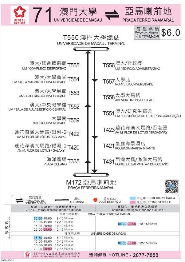 另外,经检视过去客况数据,进入暑假后,前往澳门大学的71、72、73路线搭乘人次分别减少2至3成,有见及此,于6月1日(周五)首班车开始,73路线由平日8至12分钟一班改为8至15分钟一班;72路线由平日8至15分钟一班改为10至18分钟一班;71路线周一至周五的班次由8至12分钟一班改为8至15分钟一班;73X路线停驶,上述路线直至澳门大学新学年开学日恢复原班次服务。