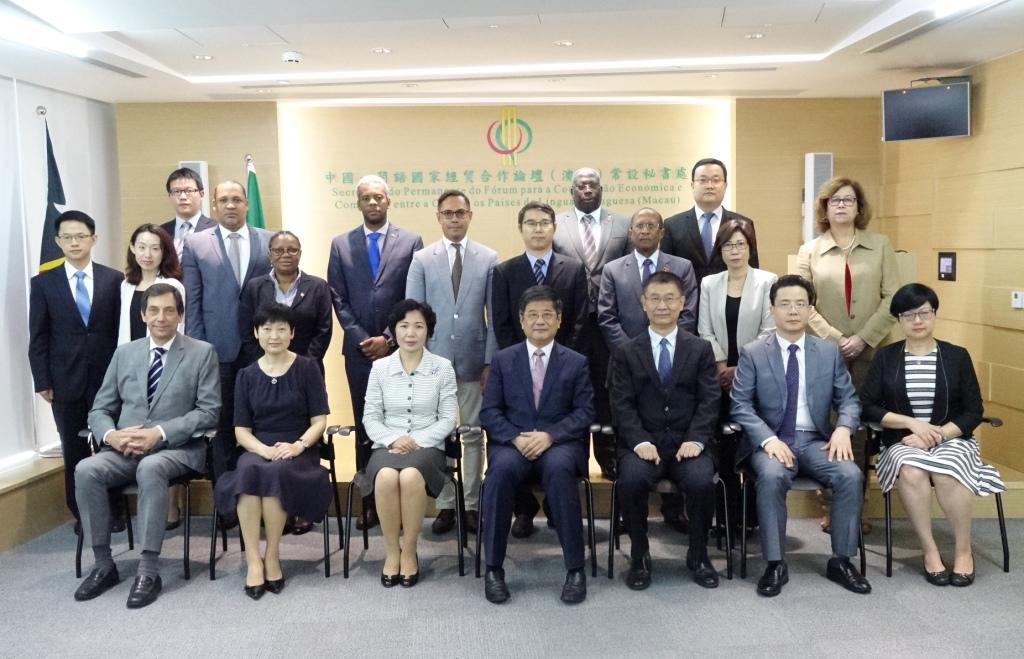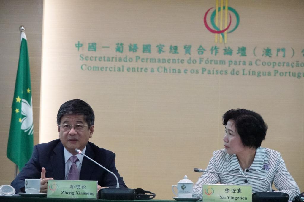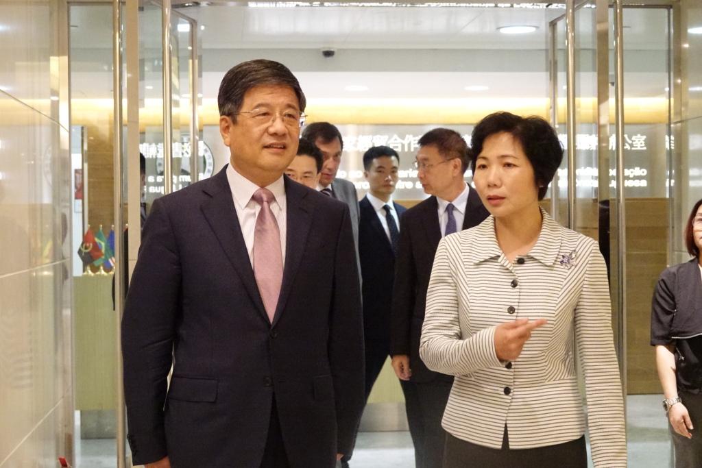 5月31日上午,中央人民政府驻澳门特别行政区联络办公室郑晓松主任在中联办姚坚副主任等陪同下,莅临中葡论坛常设秘书处考察交流、指导工作。徐迎真秘书长率秘书处全体成员出席。