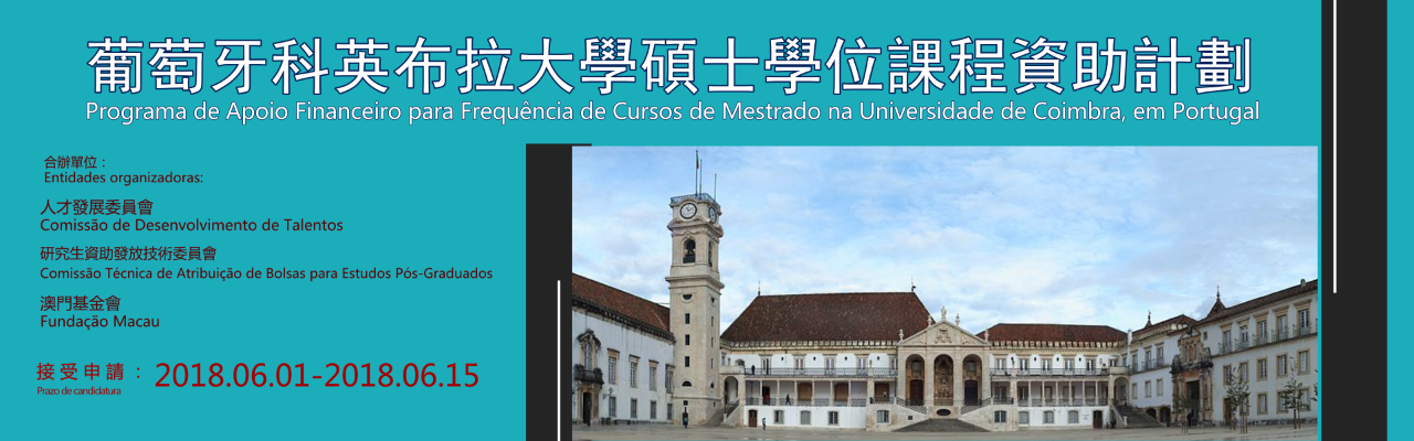 人才发展委员会、研究生资助发放技术委员会及澳门基金会合办的 “葡萄牙科英布拉大学硕士学位课程资助计划”于 6月1日至15日接受申请。