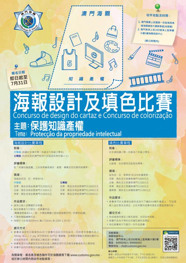 为庆祝“社区打假联络机制”成立两周年,澳门海关举办“保护知识产权”海报设计及填色比赛,推广保护知识产权的重要性,提高公众对尊重知识产权的意识。报名日期由6月14日至7月31日,比赛奖品丰富,欢迎本澳学生及市民踊跃参与。