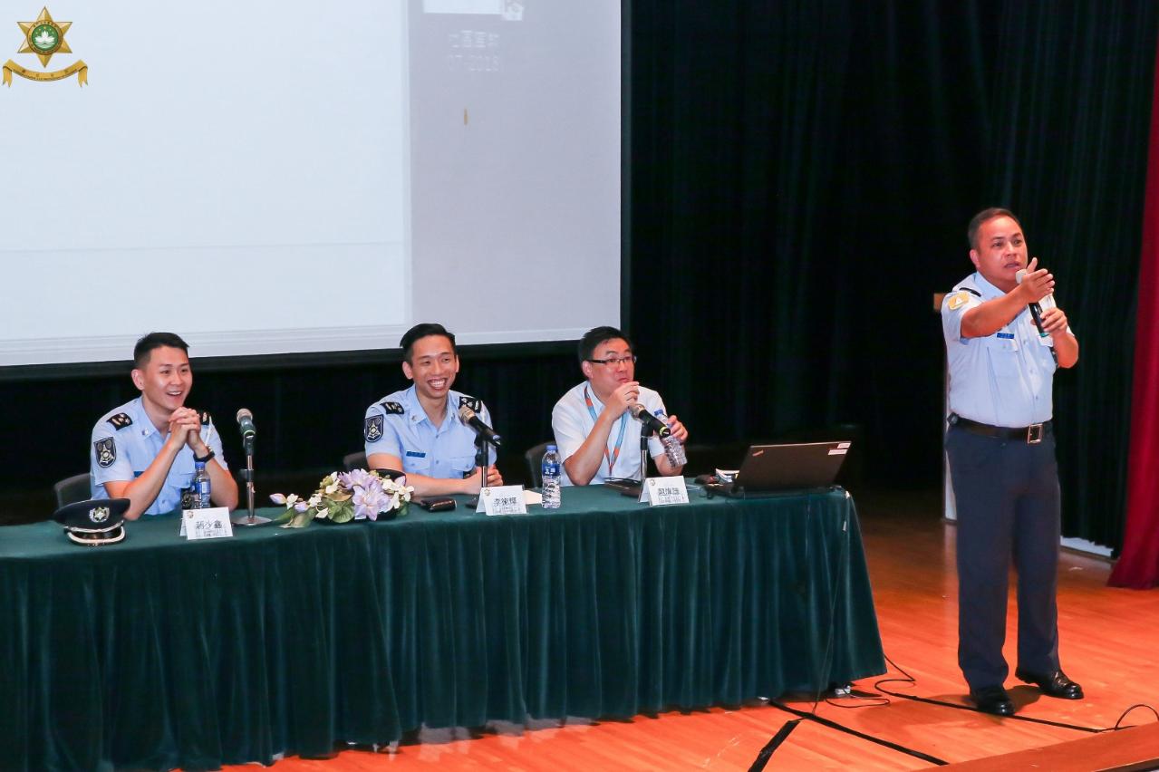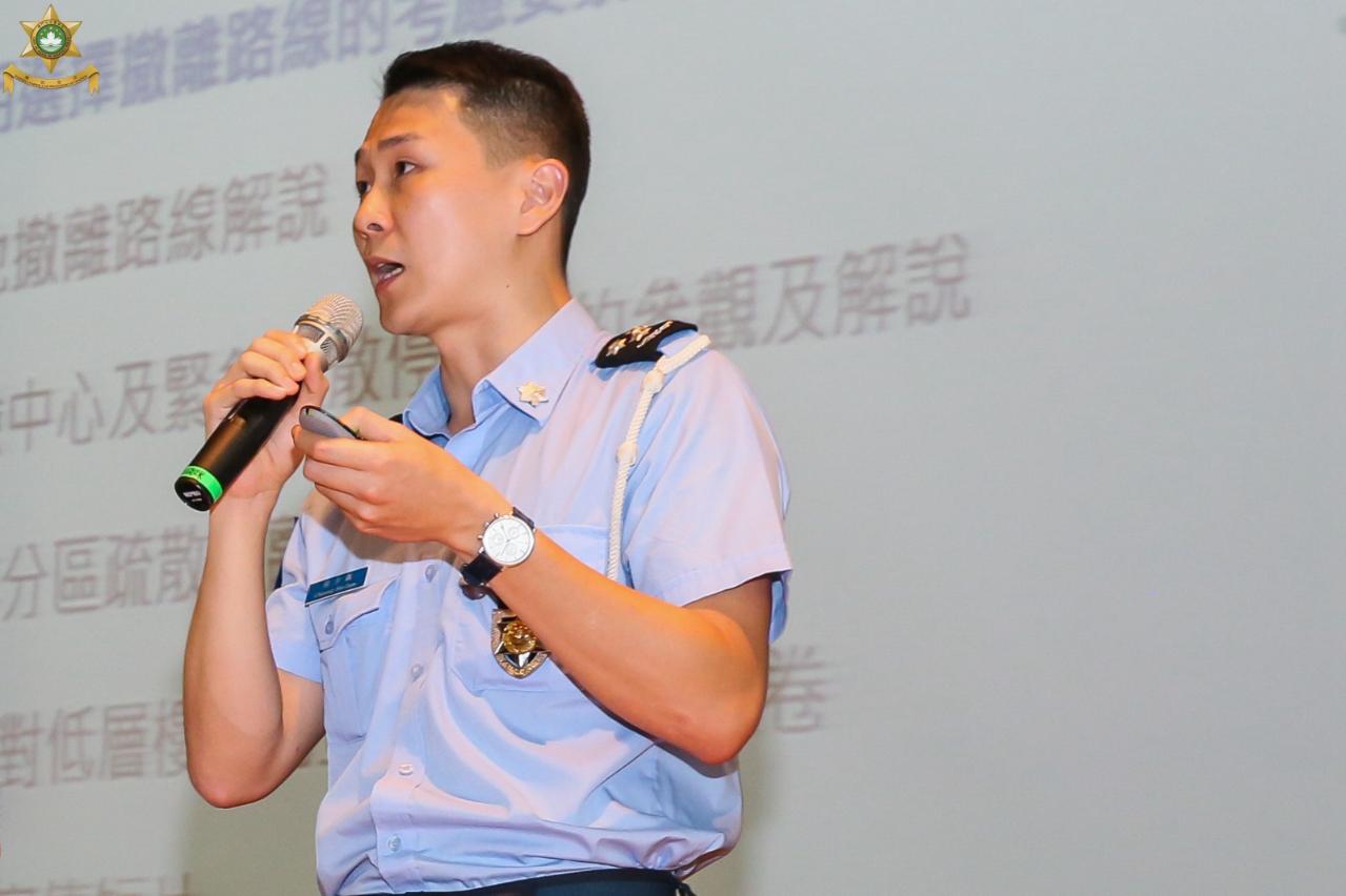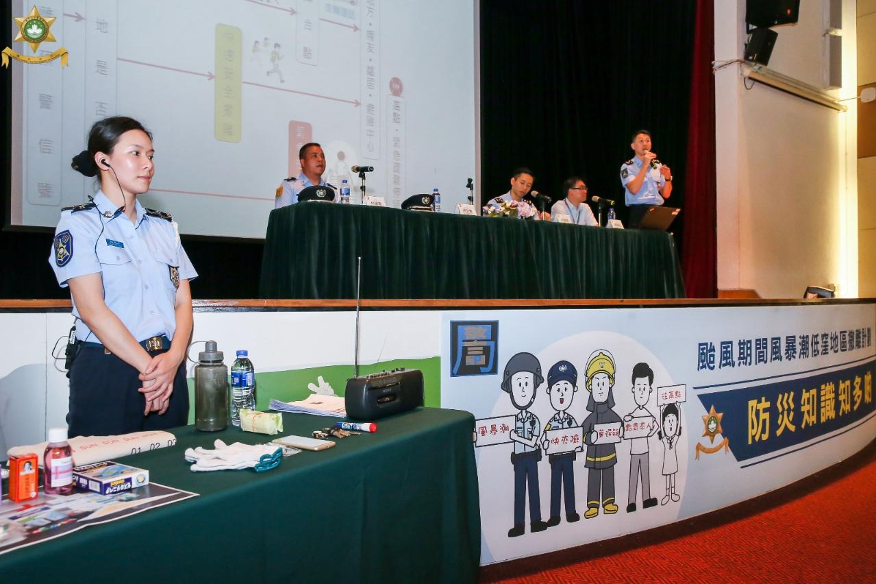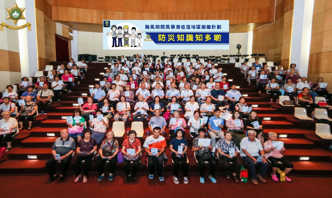 治安警察局于7月3日联同社会工作局,在中葡职业技术学校举行“防灾知识知多啲”讲座,并邀请到街总青洲坊会互助会陈凤副理事长、工联北区综合服务中心赵兰瑛主任等130多位社区代表出席,由治安警察局代表李德辉警司、蒋少鑫警司与林锦豪警长介绍“台风期间风暴潮低洼地区疏散撤离计划”的安排,台风来临前的防灾准备、应急包的准备、提早准备好用水、粮食、应急药物、生活用品、做好防风措施、密切留意撤离广播、遵照民防架构发出的指示和呼吁、尽早远离低洼地区、如何选择合适的路径及时疏散到安全的地方暂避等实用信息作详细介绍;社会工作局代表龙伟雄先生讲解避险中心的概念、介绍位于澳门半岛及离岛区的各个避险中心与集合点的位置、避险中心内的设备和物资等,并实地介绍作为避险中心之一的中葡职中体育馆。