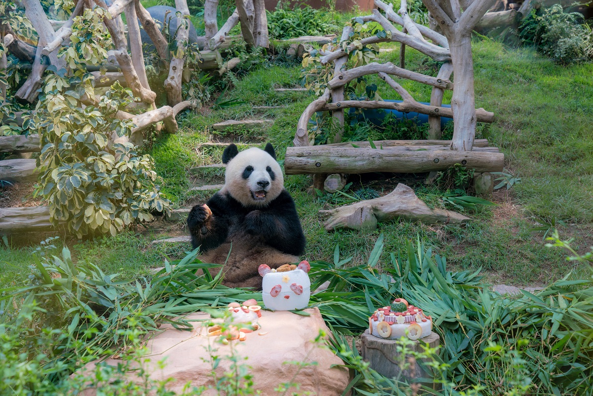 民政总署于7月5日在大熊猫馆为大熊猫“心心”举办生日会,庆祝牠的11岁生日。生日会场面温馨,市民除了亲自填写心意卡外,还合唱生日歌为“心心”送上真摰的祝福。“心心”品尝饲养员特制的冰蛋糕,虽然美食当前,“心心”仍保持优雅的食相,样子既斯文又讨喜,令大家纷纷拍下这可爱的时刻。