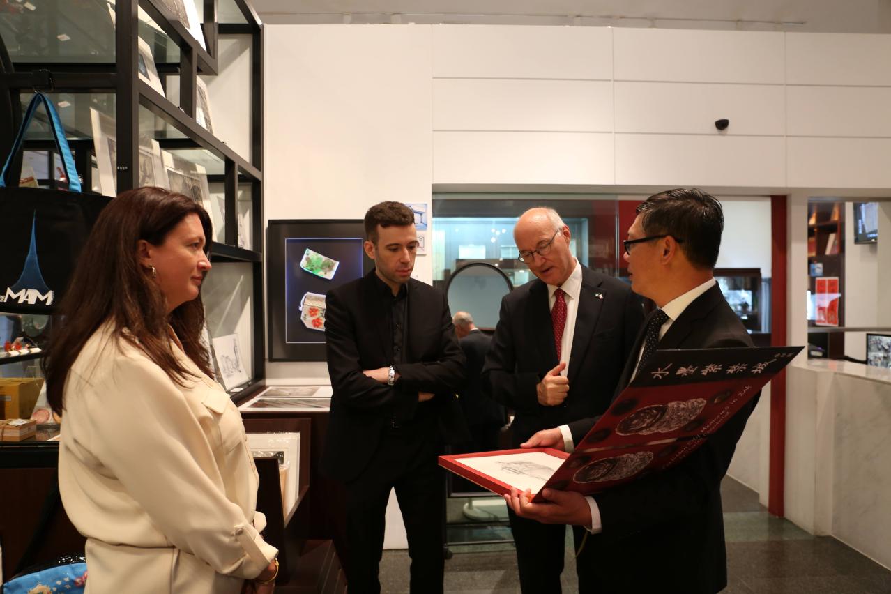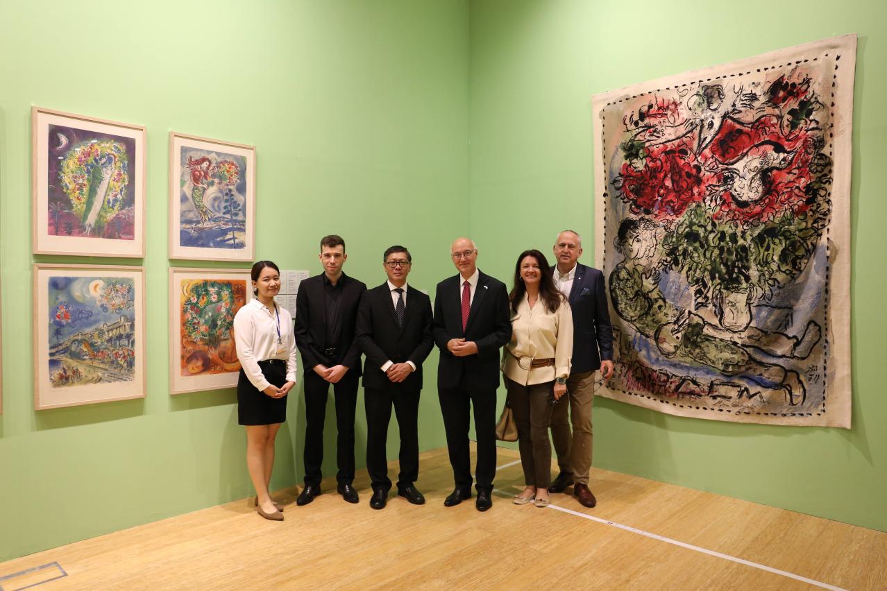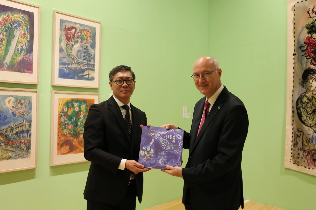 文化局澳门艺术博物馆日前(七月十四日)接待法国驻港澳总领事栢海川一行。在艺博馆馆长陈继春的陪同下,栢海川一行参观“命运的色彩──夏加尔南法时期作品展”以及到访艺博馆礼品店,双方交流愉快。