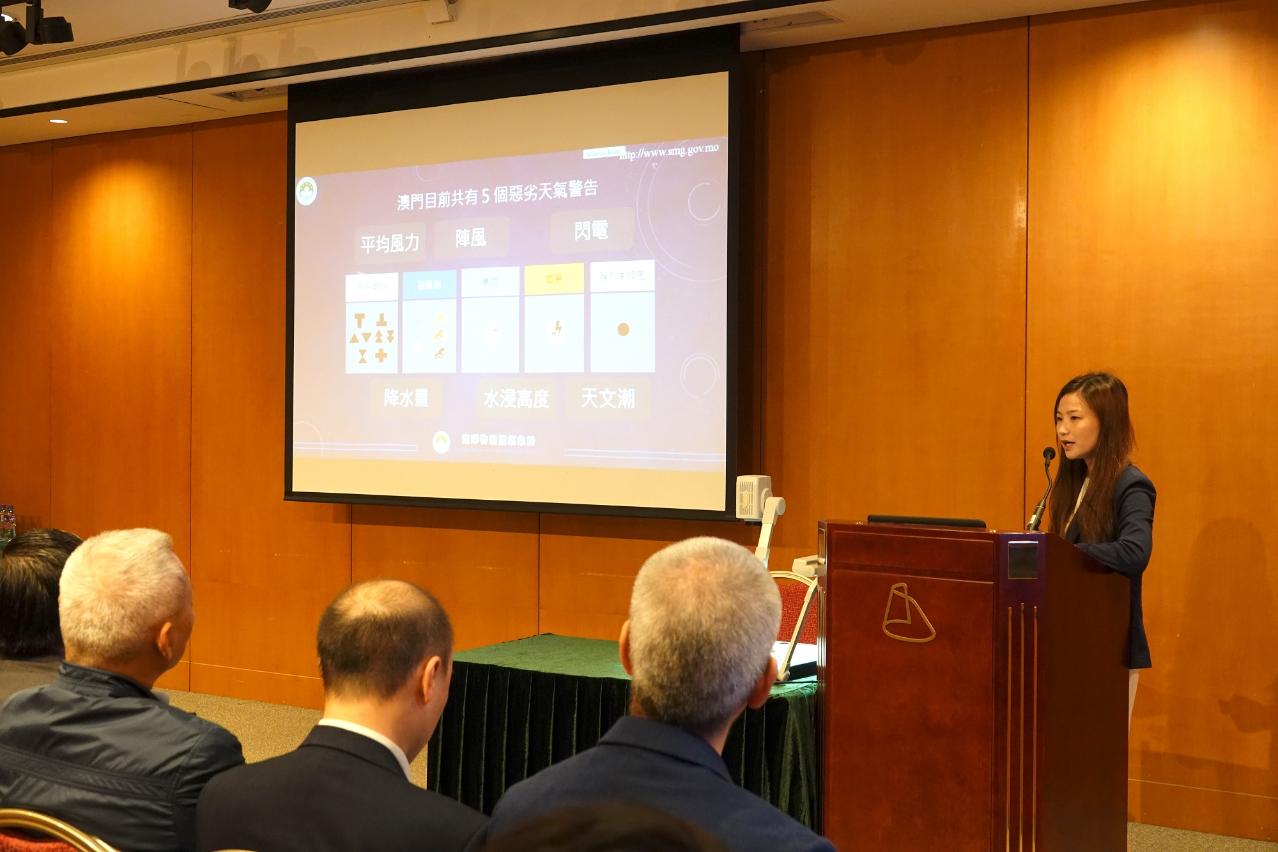 气象防灾讲座由气象局气象技术员叶婷婷和气象学会会长方志刚主持,主要向参与者讲解第61/2018号行政命令中《热带气旋信号》及第76/2018号行政命令中《风暴潮警告系统》、台风和风暴潮的基础知识、安全措施和天气变化、澳港两地发出风球的时间常有差异的原因、以及天气预报工作的困难和限制等。