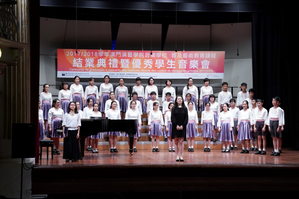 2017/2018学年普及艺术教育课程结业典礼暨优秀学生音乐会已于七月十一日举行。音乐学校为已完成各项普及课程的学生及澳门少年合唱团的团员颁发结业证书及奖状,多位优秀学生为观众带来精彩表演,获得热烈掌声。