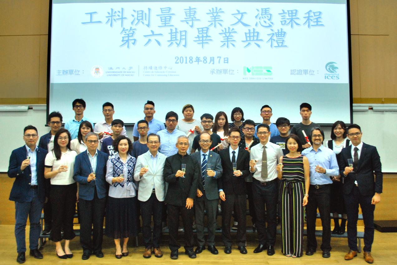 澳门大学持续进修中心日前举行第六期“工料测量专业文凭课程"毕业典礼,共有19名学员顺利取得文凭,同时亦获英国皇家特许土木工程测量师学会专业认证资格,以提升学员在建筑业的国际竞争力。