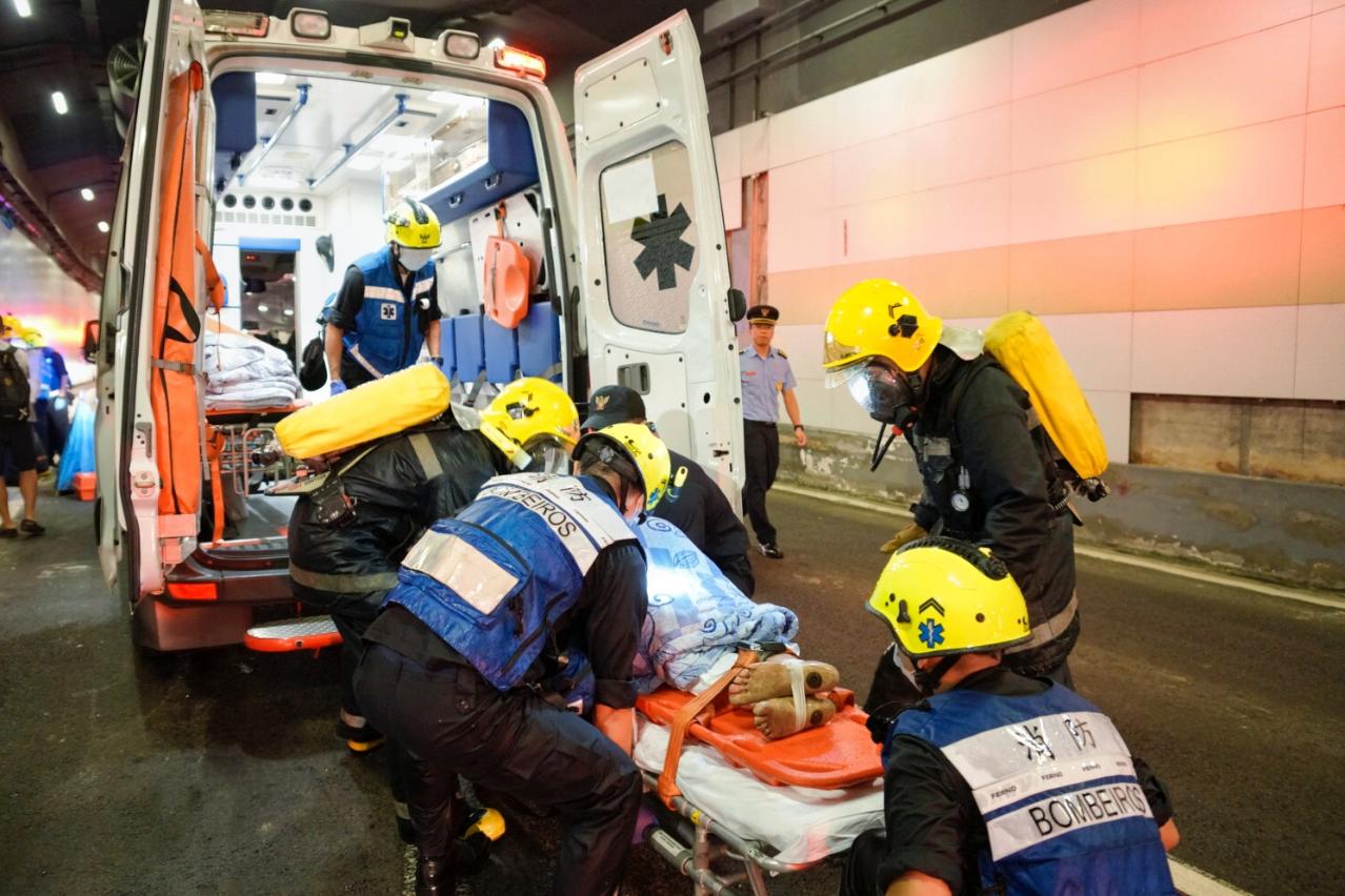 演习模拟横琴往氹仔方向的河底隧道行车道,有一辆私家车在驶至近12号逃生门附近时,与一辆巴士发生追尾碰撞,私家车司机被困车内,车头冒烟起火,火势触动隧道的消防系统,而巴士上共有10名乘客均受轻伤。受事故影响,往氹仔方向的行车管道严重堵塞而无法通行,消防局接获报警后,立即按照相关预案调派救援车辆前往事故现场处理。到达现场后,消防员迅速展开灭火救援工作,期间救出伤者,并为巴士上之伤者进行检伤分类及送往医院治理。