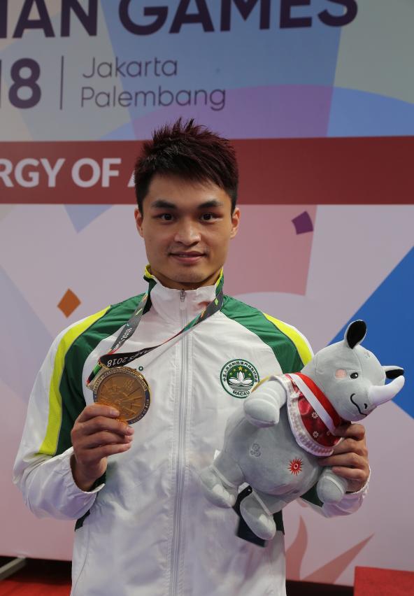在印尼参加‘第十八届亚洲运动会’的中国澳门体育代表团,今日(21日)在武术项目获取奖牌,黄俊华(HUANG JUNHUA)在男子南拳及南棍全能项目以总分19.43获得金牌,是体育代表团今届亚运会首面奖牌,也是澳门代表团参加亚运会以来第二面金牌。