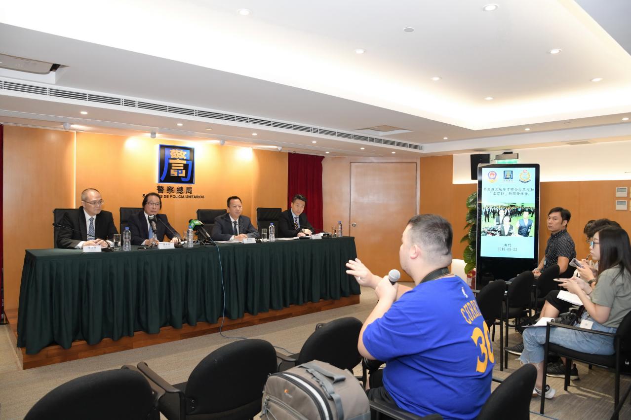 由粤港澳三地警方联合执行的打黑行动“雷霆18”于2018年8月23日上午十时举行同步发布会。澳方发布会在警察总局举行,警察总局羅伟业局长助理、海关黄文忠助理关长(代任)、司法警察局陈坚雄副局长及治安警察局黄伟鸿代副局长出席发布会,并在会上公布有关行动的统计数字,总结打撃成效。