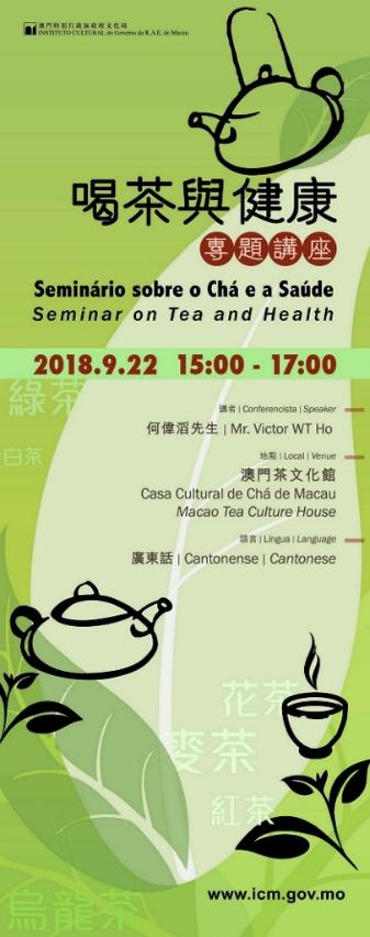 “喝茶与健康”专题讲座于九月二十二日(星期六)下午三时至五时在澳门茶文化馆举行,由澳门专业营养师协会会长和成都中医药大学客席讲师何伟滔主讲,从营养学的角度介绍喝茶的保健疗效和各种茶的营养组成,藉此让市民瞭解“茶疗”的重要性及认识如何通过喝茶来对抗各种常见都市病,讲座名额四十五名。