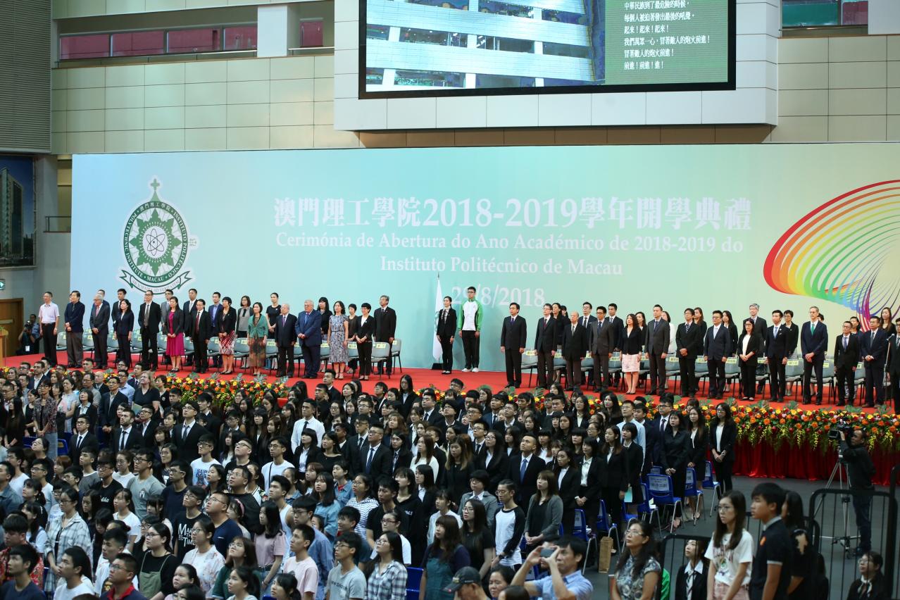 为培养学生爱国爱澳情怀,澳门理工学院于8月29日举行的2018/2019学年开学典礼上进行升国旗仪式。九百多名新生、社会贤达、奖学金机构、海内外大学代表、理工师生员工、校友及家长逾二千人聚首理工体育馆,雄壮的国歌响起,全体人员注目仰望庄严的国旗冉冉升起,共唱国歌,充满对祖国的无比敬仰和自豪。