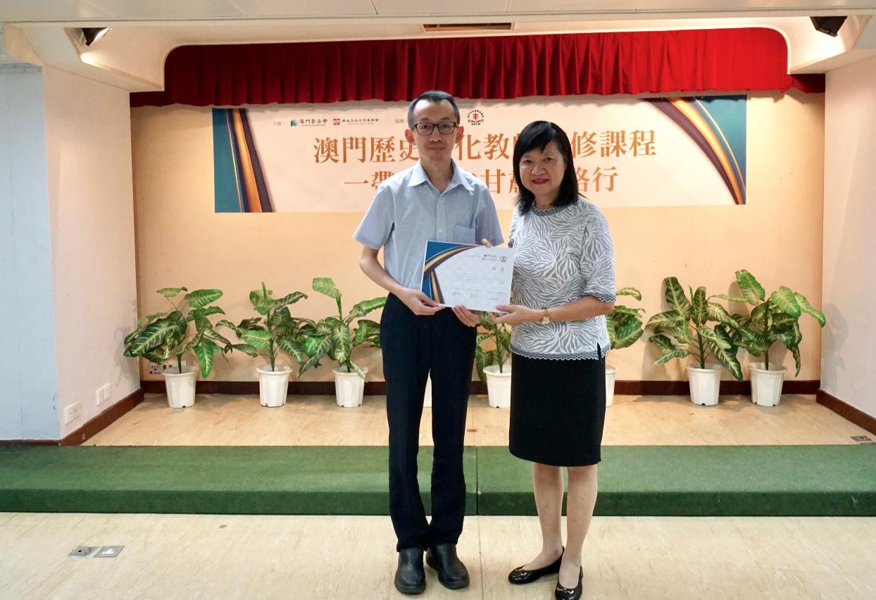 由澳门基金会历史文化工作委员会主办、澳门中华教育会及澳门天主教学校联会协办的“2018澳门历史文化教师研修课程─一带一路之甘肃丝路行”于8月30日晚在澳门中华教育会礼堂举办总结分享会,主办单位向十九名完成课程的教师颁发课程证书。