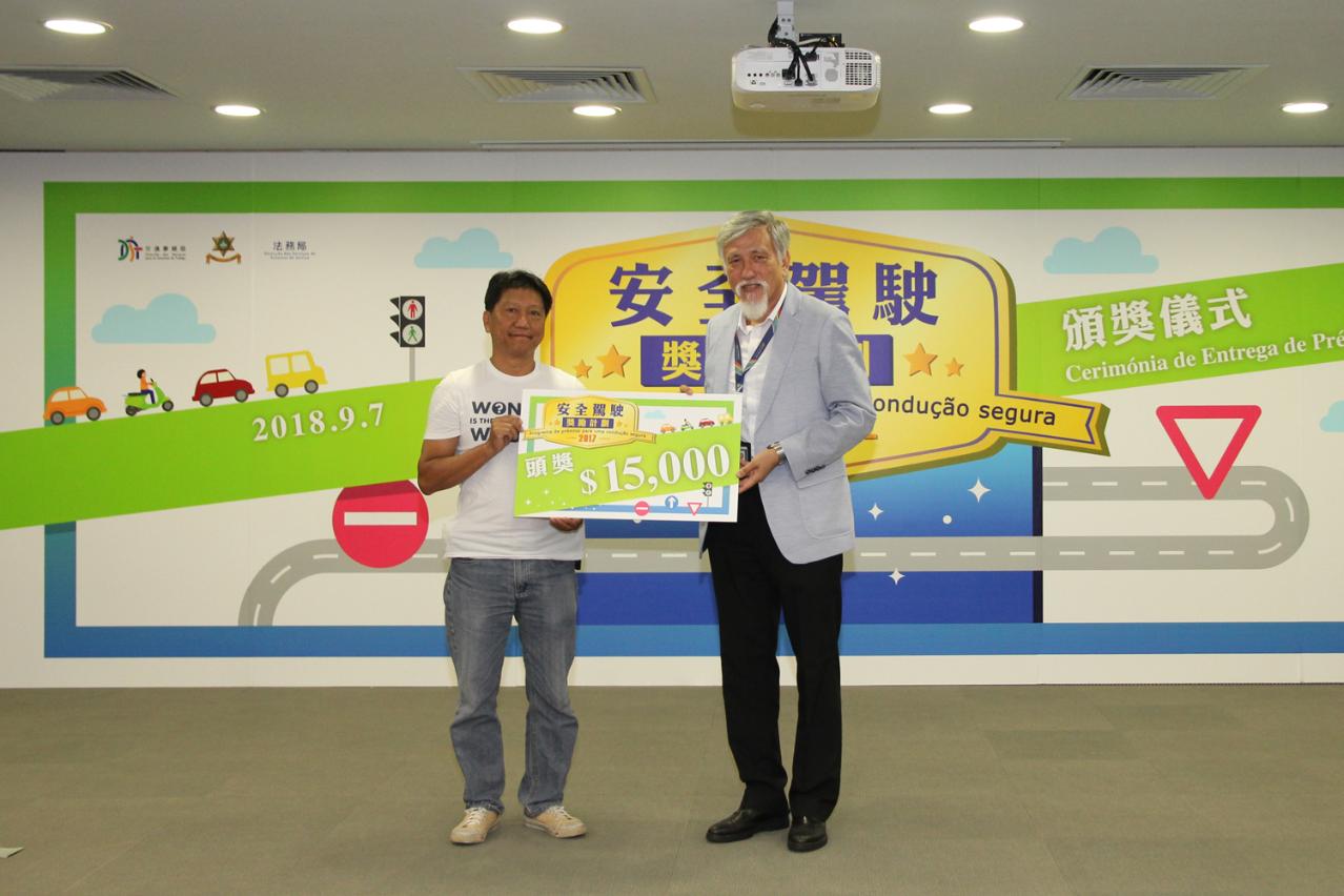 主办单位于9月7日(周五)在交通事务局多功能厅举行了“安全驾驶奖励计划2017”颁奖仪式,由交通事务局副局长贾靖龙、代副局长邝伟卓;治安警察局交通厅代厅长李昶文、法务局法律推广及公共关系厅厅长罗静萍、教育暨青年局教育设备处处长黄超然、澳门街坊会联合总会副理事长陆南德、澳门妇女联合总会副理事长吕绮颖、工联氹仔湖畔综合服务中心干事欧嘉辉及澳门学联少年警讯活动委员会总监郑健森,向头三奬共九名得奬者颁发奬金,头奬得主林艳馨可获奬金15,000元,二奬得主梁永强、MAK CHI HUNG及ZHAO BAOXIN各得奖金8,000元,三奬得主季秋玲、关文雄、CHU KIN、LO PING SUM BENSUM及IU WAI IN各得奖金3,000元,余下得奖者已于早前陆续领奖。