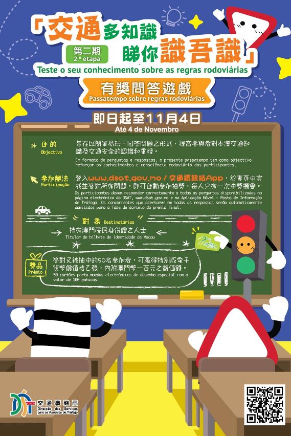 交通事务局推出第二期“交通多知识 睇你识吾识”有奖问答游戏,即日至11月4日,市民可登入交通事务局网页www.dsat.gov.mo或交通信息站手机应用程序(App)填写答案及报名,答对所有问题又被袖中者,可获内附澳门币100元之特别版电子货币储值咭一张,得奖名额50名,欢迎踊跃参与。