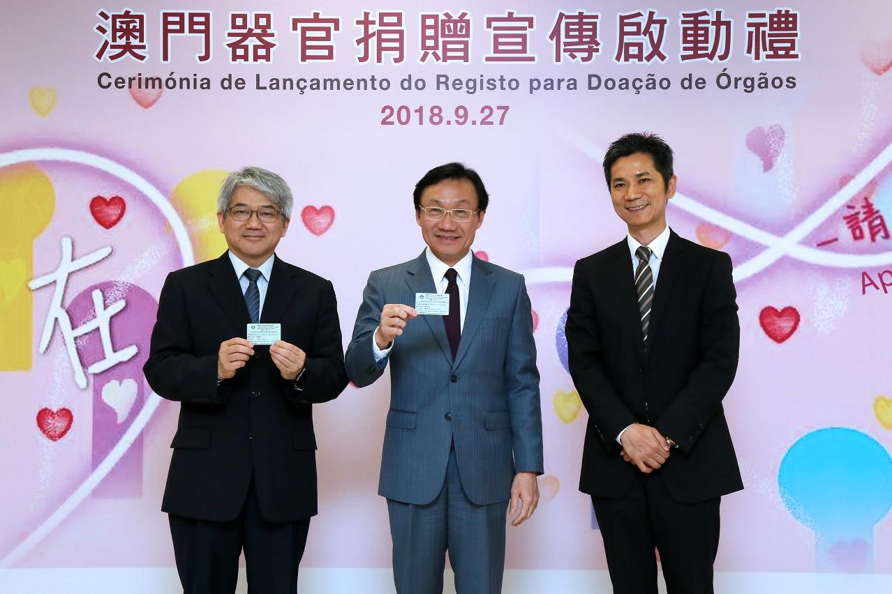 为鼓励和推动社会共同支持器官捐赠,积极登记成为器官捐赠者,社会文化司谭俊荣司长今日(9月27日)出席“澳门器官捐赠宣传启动礼",主持卫生局器官捐赠信息专页开通仪式,并与卫生局李展润局长率先登记成为器官捐赠人,与会嘉宾还包括来自本澳社团、生命科学道德委员会、医疗机构及医护团体的代表。