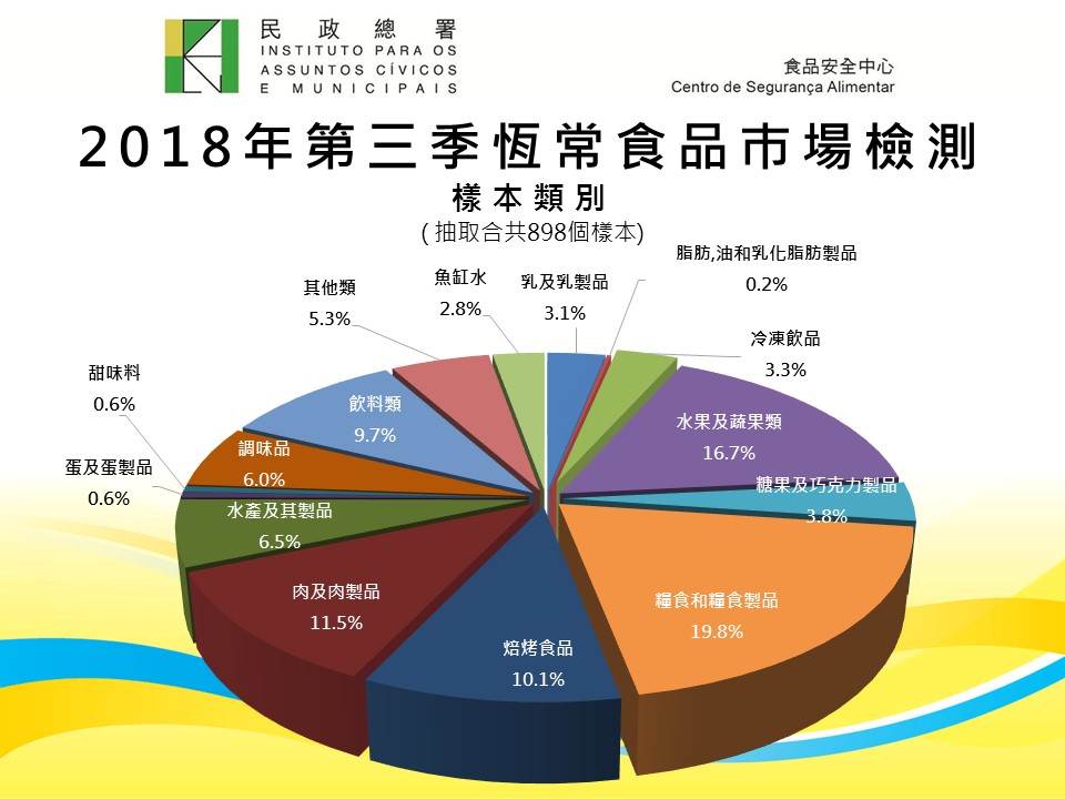 另外,民署公布2018年第三季恒常食品市场检测结果,整体合格率达99.8%。民署食安中心在本年第三季于本澳各区超级市场、杂货店、百货公司、饮食场所、网店及外卖店等,抽取各类即食食品、饮品、粮油食品、零食等,合共抽取八百九十八个样本进行化学、微生物学及辐射水平等检验,有两个样本未能通过检测。