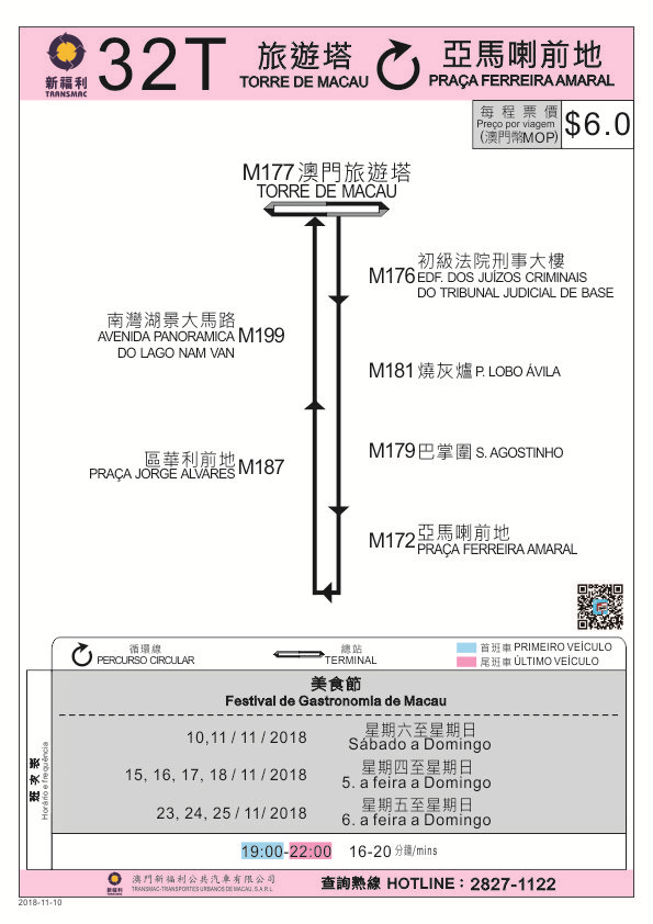 因应周末及大赛车期间为美食节的人流高峰期,交通事务局于11月10日(周六)至11日(周日)、15日(周四)至18日(周日)、23日(周五)至25日(周日)晚上临时开通32T路线,连接旅游塔至亚马喇前地,以疏导大量客流及方便公众换乘。呼吁乘客留意。