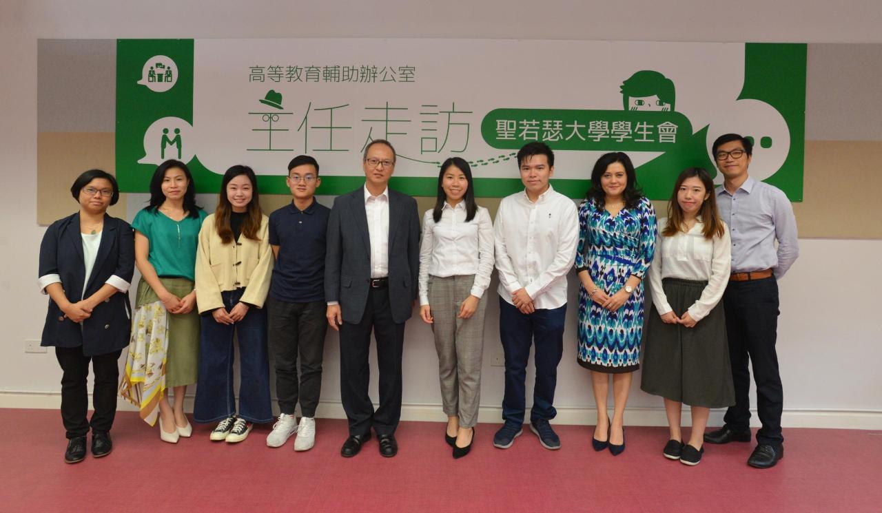 高教办主任苏朝晖率领副主任何丝雅、高校学生辅助组职务主管黄月冰亲身走访圣若瑟大学青洲新校舍,获得圣若瑟大学学生会会员大会主席谭慧瑜、副主席欧阳文浩的热情接待,并在他们的陪同下,参观圣若瑟大学鲍思高礼堂、学生会办公室,瞭解学生会日常运作情况。