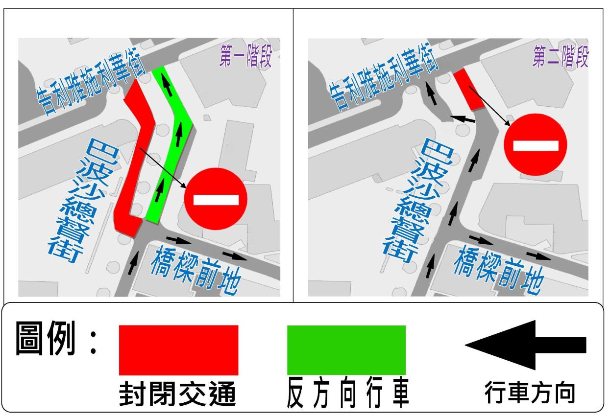 配合民政总署重整道路、天然气及电讯公司铺设管道,11月19日(周一)至12月30日(周日),氹仔巴波沙总督街分两阶段实施临时交通管制(详见下表),交通事务局呼吁驾驶者留意。
