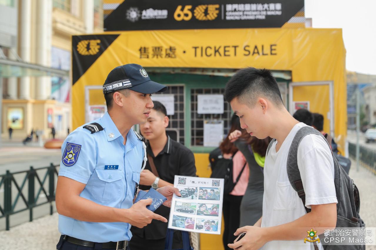 因应第65届“澳门格兰披治大赛车”举行,预料吸引大量旅客来澳欣赏,治安警察局人员今日(16日)下午,于各赛车看台附近人流畅旺及游客聚集的地点,派发防扒窃宣传单张及印有防罪信息的宣传品,以提高公众防罪意识。呼吁市民和游客在人多挤迫的地方,如街道、店铺和食肆等,或乘搭公共交通工具时,应提高警觉,小心保管好随身物品,以免让不法之徒有机可乘。如遇到罪案发生时应该保持冷静,并立即报警求助。