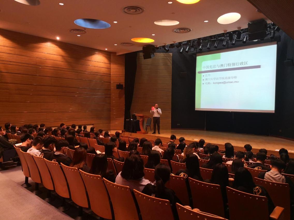 为了加强旅游学院学生对国家“宪法”与“基本法”之间关系的认识,透过澳门基本法推广协会的协助安排,邀请到澳门大学法学院高级讲师江华博士,于11月1日到学院举行了以“中国宪法”与“澳门基本法”关系为主题内容的讲座,共有约九十名学生出席。江华博士以简单易懂和轻松的手法让学生们认识国家“宪法”和“基本法”的关系,同时也为他们讲解了中央、国务院与澳门特别行政区的关系,澳门特别行政区是中华人民共和国的一部份,国家在澳门特别行政区实行“一国两制”,澳人治澳及高度自治的方针,以及“宪法”和“一国两制”当中所包含的法律规范和意义。