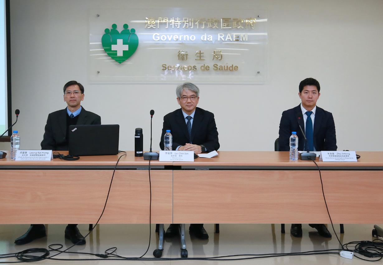 卫生局今日(12月10日)举行新闻发布会,公布「智慧医疗」初步成果。卫生局局长李展润、卫生局组织暨电脑厅厅长梁基雄、阿里云机器智能高级专家朱金童共同出席了发布会。