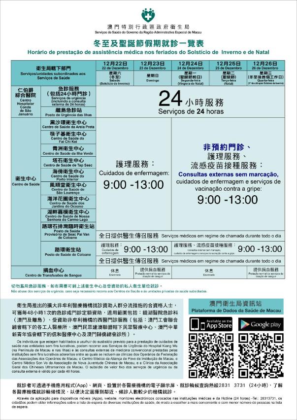 仁伯爵综合医院急诊服务、住院服务、离岛急诊站如常提供24小时服务;血液透析室于12月22日(星期六)、24日至26日(星期一、二、三)由上午8时至下午9时如常提供服务,于12月23日(星期日)休息。各专科门诊、医院药房及盖印处服务于12月22日至26日期间休息,但肿瘤科及神经内科门诊于12月22日提供已预约门诊服务,医院药房及盖章服务于同日上午9时至下午5时提供服务。