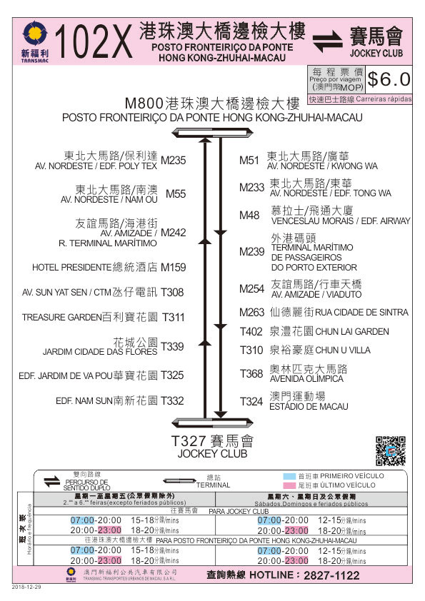 交通事务局经检视车辆的营运及市民的乘车习惯后,12月29日(周六)首班车起,102X路线于“港珠澳大桥边检大楼”站开出,原线至“慕拉士/飞通大厦”站后,新增停靠“外港码头”站再按原线行驶,以便利旅客搭乘。