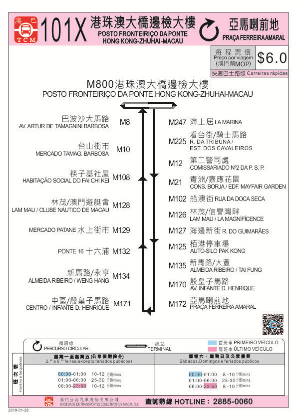 随着港珠澳大桥澳门口岸出入境人流增多,交通事务局经检视客流量及营运情况后,由1月26日(周六)首班车起,101X路线新增停靠“青洲/嘉应花园”站、“林茂/信誉湾畔”站及“林茂/澳门游艇会”站;102X路线(往港珠澳大桥方向)则新增停靠“葡京酒店”站;同时,为疏导人流及便利公众,101X及102X路线部份时段加密班次,且102X路线服务时间由原来上午7时至晚上11时延长至上午6时至凌晨12时。
