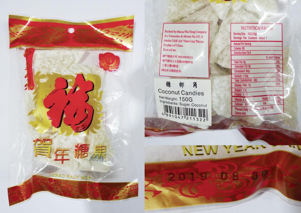 特区政府透过时令食品检测抽样监察,于各零售点抽取贺年食品样本进行微生物及化学检测。根据检测结果,有一预包装糖椰角样本检出含百万分之一千二百九十的二氧化硫,该产品抽取自佑汉区一超级市场的“信”牌糖椰角,每包装净重150克,标示之食用期限为2019年8月30日,供应商为澳门惠康公司。针对上述不合格样本,当局已即时通知涉事商户检测结果,要求有关店铺即时停售及回收问题产品,并追查产品的来源和分销情况。巿政署食品安全厅亦同时发出食品预警,通知供应商及零售商停售受影响批次的产品。