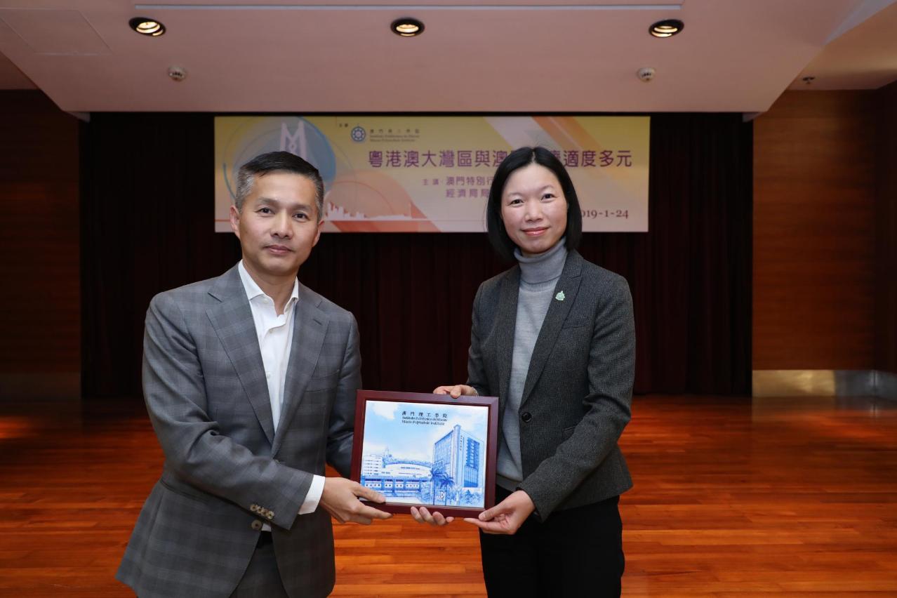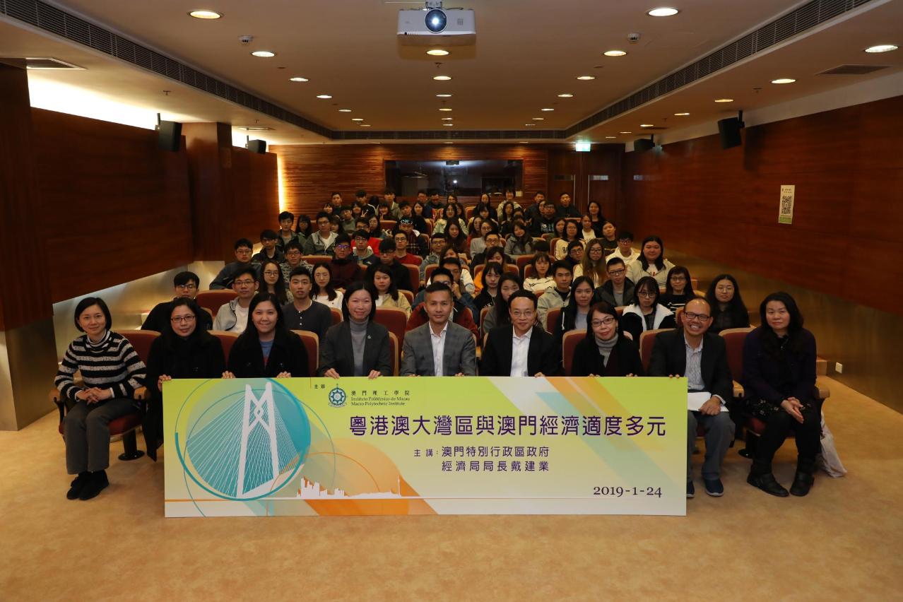 澳门理工学院为加强大学生对粤港澳大湾区与本澳经济适度多元的瞭解,一月二十四日在汇智楼演讲厅举行“粤港澳大湾区与澳门经济适度多元”专题讲座,澳门特区政府经济局局长戴建业主讲,讲解把握和发挥澳门在粤港澳大湾区中的角色及独特优势,加强区域合作,积极推进澳门经济适度多元发展,近百名师理工学生出席。